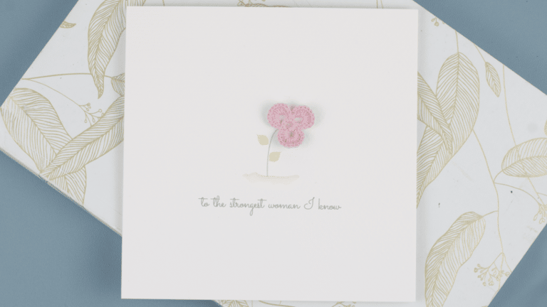 An image of Njomza, co-founder of Nyoki Handmade, crafting crochet flowers with organic yarn to embellish birthday cards.