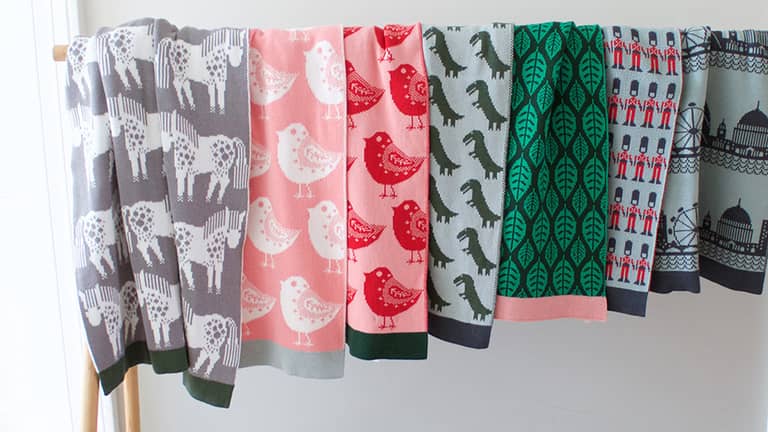 Her work is produced at her home studio in Norwich on domestic knitting machines, as well as working with a small family run knitting factory in Scotland to produce the blankets and gloves.