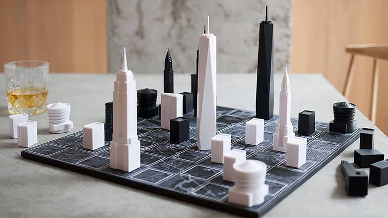 We design our cities using 3D printing technology to carefully prototype the selected pieces and ensure that we have the correct size, proportion and detail. From here we manufacture using high quality materials and weight each piece to give them the correct feel when playing. Our sets are finished in classic black and white and suit any chess board.