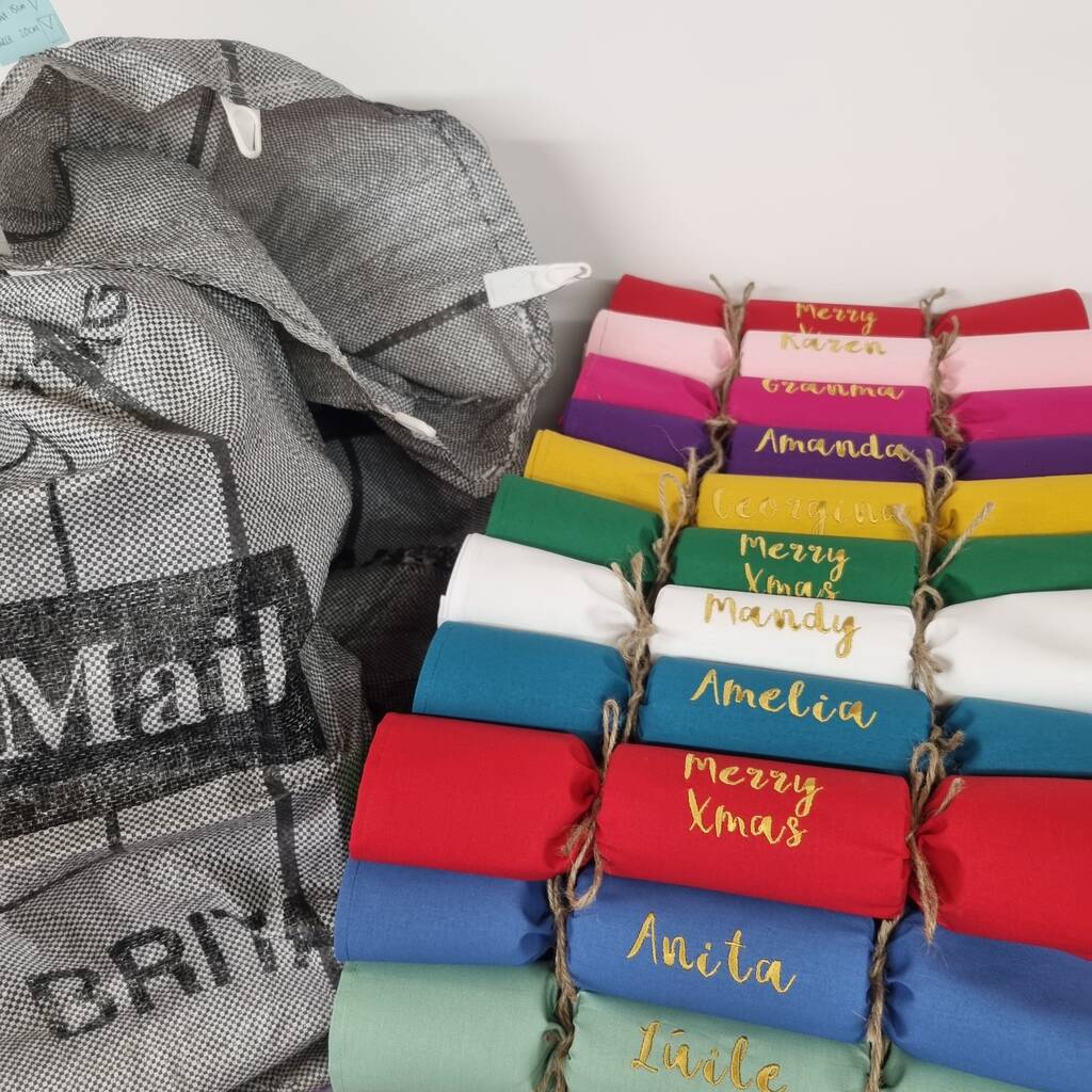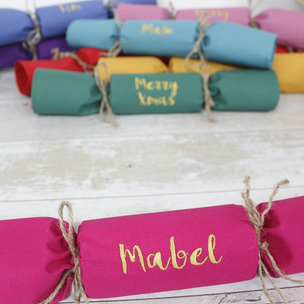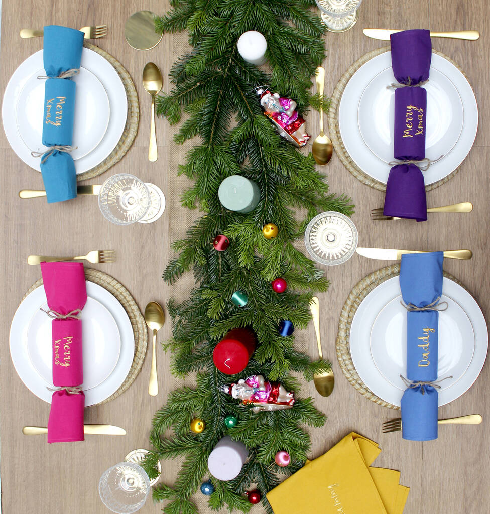 Our reusable crackers are personalised with a golden embroidered name or message, which makes them an ideal place setting for your Christmas table.