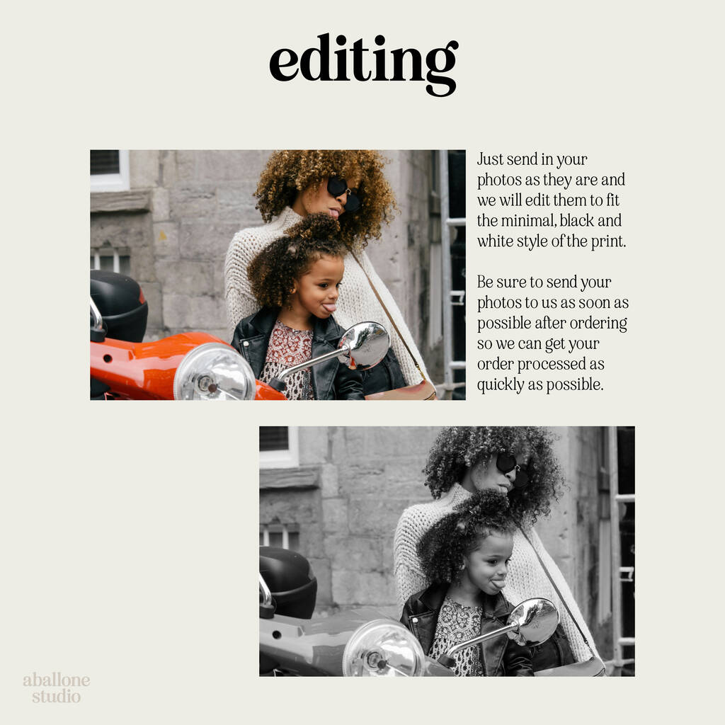 Sending photos couldn't be easier! Once ordered, go to the 'my orders' section and create and order enquiry where you can attach the photo you would like on the print. We will edit all photos to be black and white for a sophisticated, minimalist print design. For this design, please be sure to include a portrait photo, or one that can be easily cropped to landscape. If you would like to keep the colour of your images, please message us first so we can confirm this is possible.