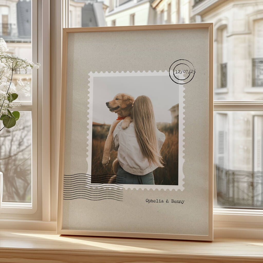 Transform your cherished memories into a unique piece of art with our personalised photo stamp print, the perfect wedding gift for newlyweds, photo gift for your favourite couple, or family photo gift for a friend's new home. This beautifully crafted print your choice of photo carefully curated into a stamp design, overlayed with a vintage style franking effect and bespoke text in the bottom right and a custom date in the top left corner. This makes for the perfect way to remember dates, places or any other special details of your favourite memory. This is the perfect gift for stamp lovers or those who love to send letters with a vintage style! Personalise this print for your husband, wife, boyfriend, girlfriend or close loved one for a sentimental memory keepsake. Just send us your photo via the chat when you have ordered and we can edit it into black and white for you if you prefer - just let us know in the personalisation box. Not only is this the perfect engagement or wedding gift, but it is ideal for an anniversary! Whether it's for a 1st anniversary gift or a 40th wedding anniversary gift, this custom print is sure to be a special surprise.