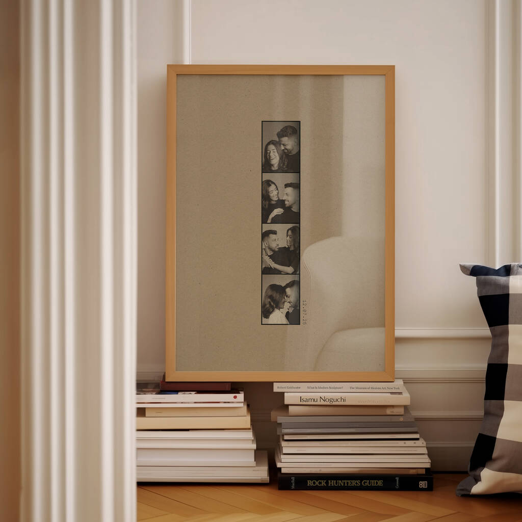 Transform your cherished memories into a unique piece of art with our personalised photobooth style print, the perfect wedding gift for newlyweds or memory piece for your new home. This beautifully crafted print features a bespoke date and four photos of your choice, edited into a photobooth black and white style by us. This makes for the perfect way to remember locations, dates or any other special details of your favourite memory. Just send us your photo via the chat when you have ordered and we will edit it into black and white for you. Not only is this the perfect engagement or wedding gift, but it is ideal for an anniversary! Whether it's for a 1st anniversary gift or a 40th wedding anniversary gift, this custom print is sure to be a special surprise.