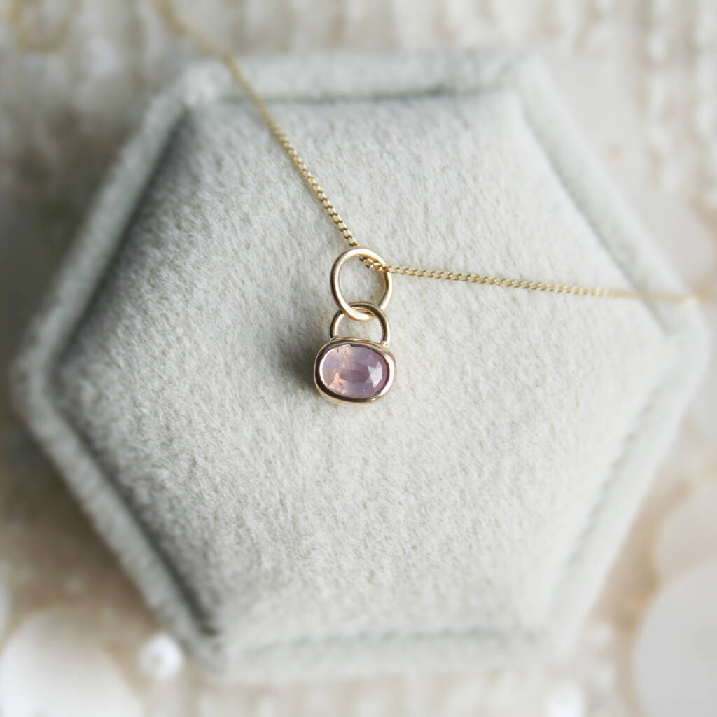 An alluring, silky pale pink sapphire bezel set in 9ct yellow gold, can be purchased with or without 9ct gold chain.