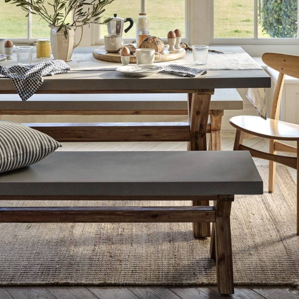 Our Hanover Table & Bench set is crafted from solid acacia, with a robust polystone table top.
