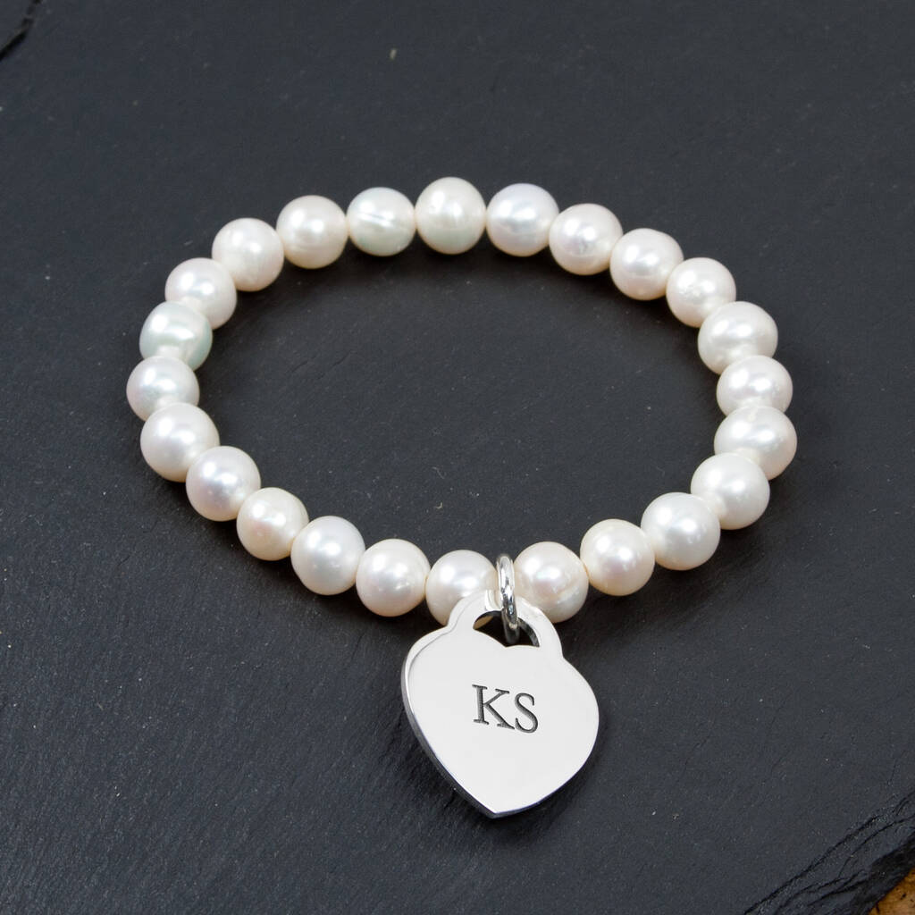 This exquisite bracelet combines the classic allure of lustrous freshwater pearls with the intimate touch of a custom engraved silver-plated heart charm.