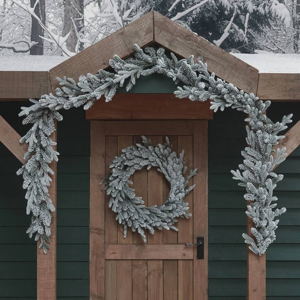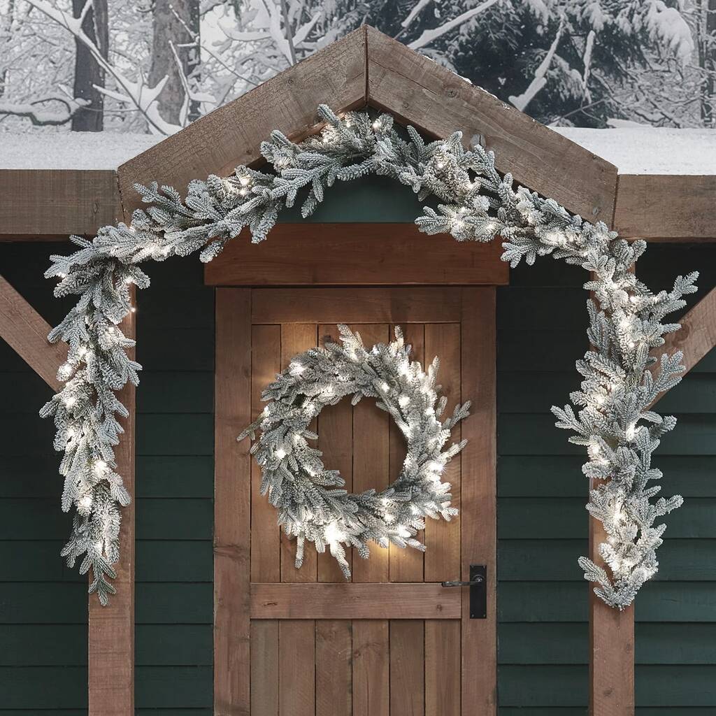 Pre Lit Outdoor Snowy Christmas Wreath And Garland