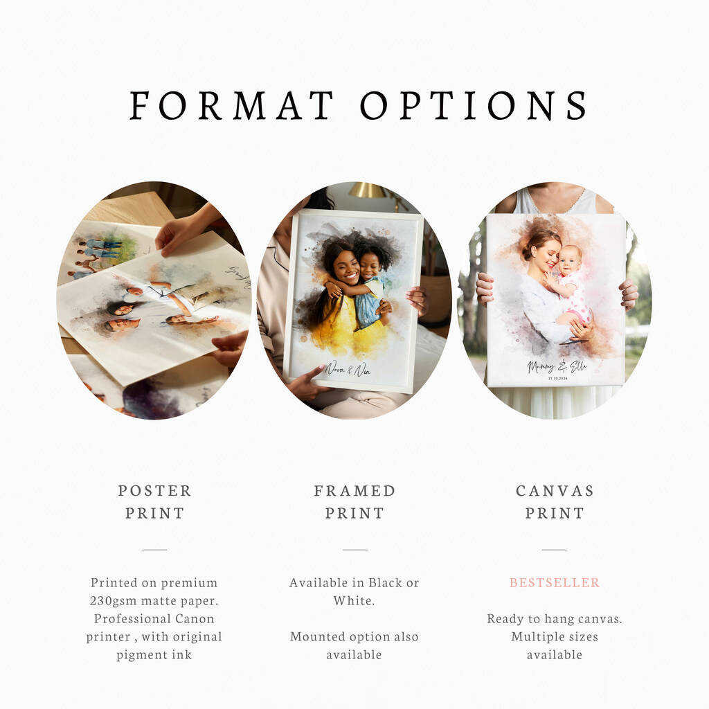 1. Choose your preferred print size and format: framed, digital canvas, or print.