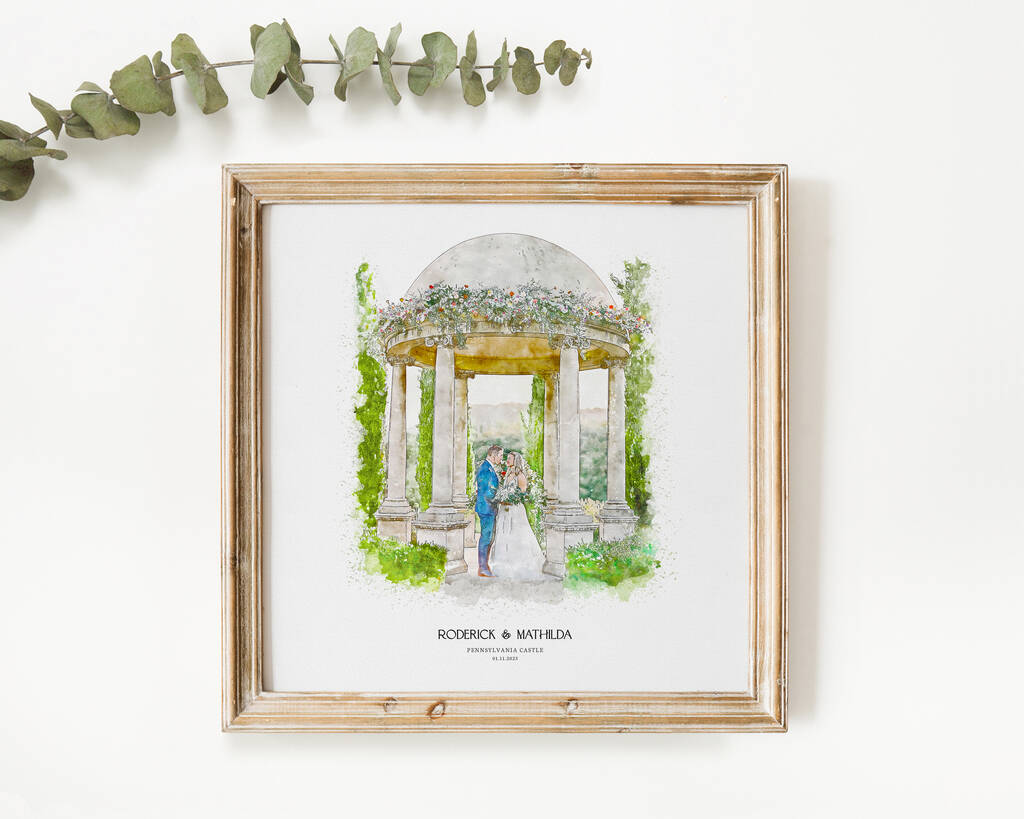 A beautiful personalised watercolour painting of your wedding venue, digitally created from your photo – a perfect first anniversary gift or present for couples.