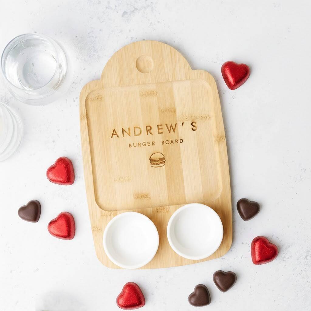 Personalised Bamboo Burger Board With Dip Bowls Valentine's Day Gift For Him