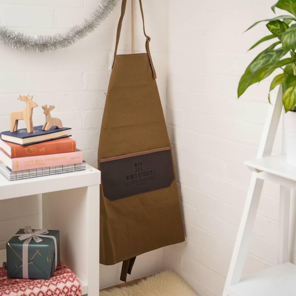 Personalise the leather pocket with one of our mother’s day designs -‘THERE IS NO PLACE LIKE… Mum’s / Dad's Kitchen’ ‘Mum's / Dad'sKitchen LOVE FROM CHRISTINA AND NATHAN’ ‘MUM’S / DAD'S KITCHEN, HEART OF THE TILFORD HOME EST. 1976’ for a truly unique and thoughtful gift for mum, or dad, Grandma or Grandad.