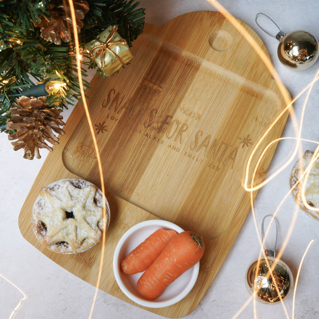 Add a touch of magic to your Christmas Eve tradition with our Personalised Santa and Rudolph Snack Plate. Crafted from eco-friendly bamboo wood, this delightful plate is designed to make your Christmas traditions even more special. You can personaliee it with the names of your children for a truly magical touch.