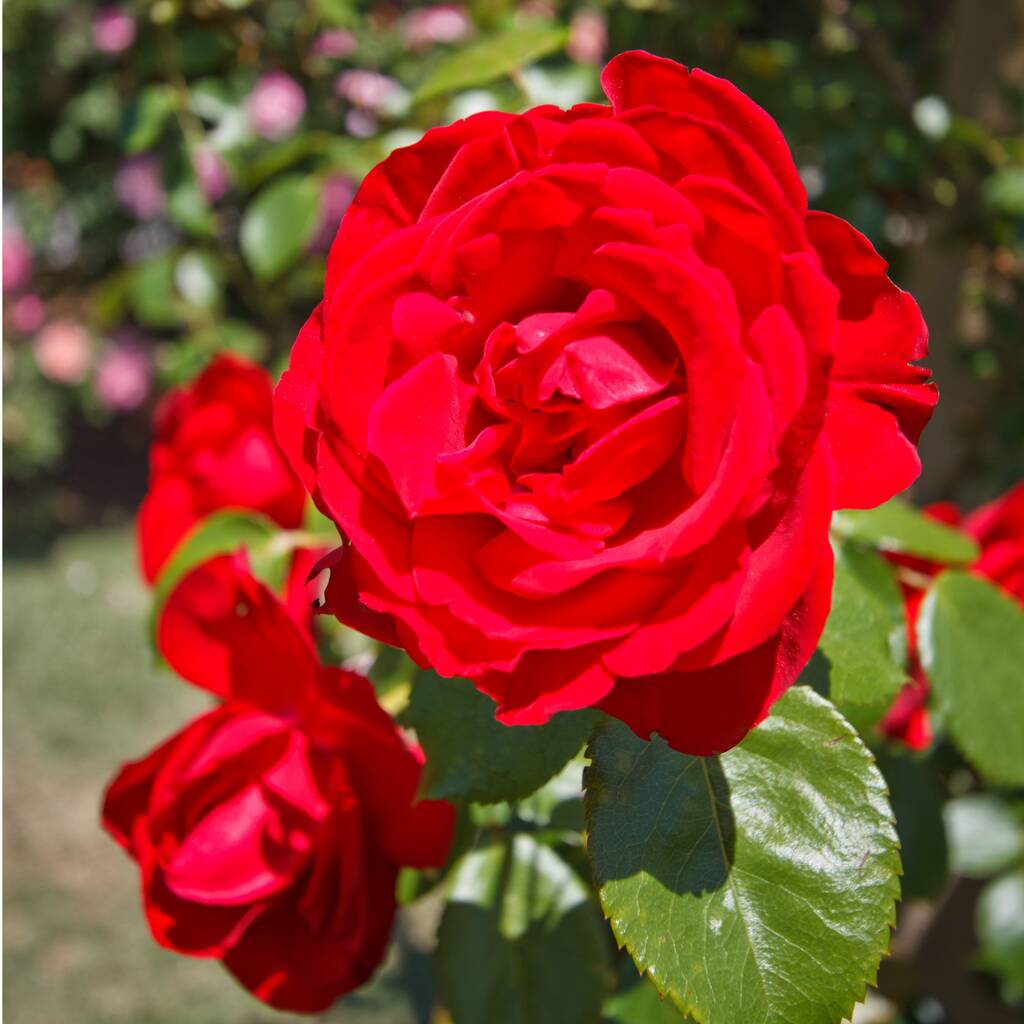 With large healthy glossy leaves, the Rose produces clusters of medium sized fully double, bright scarlet-crimson flowers.