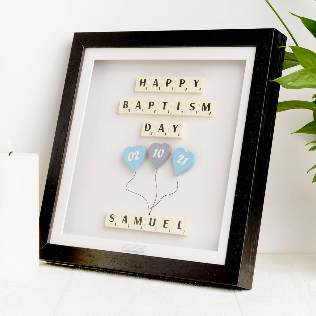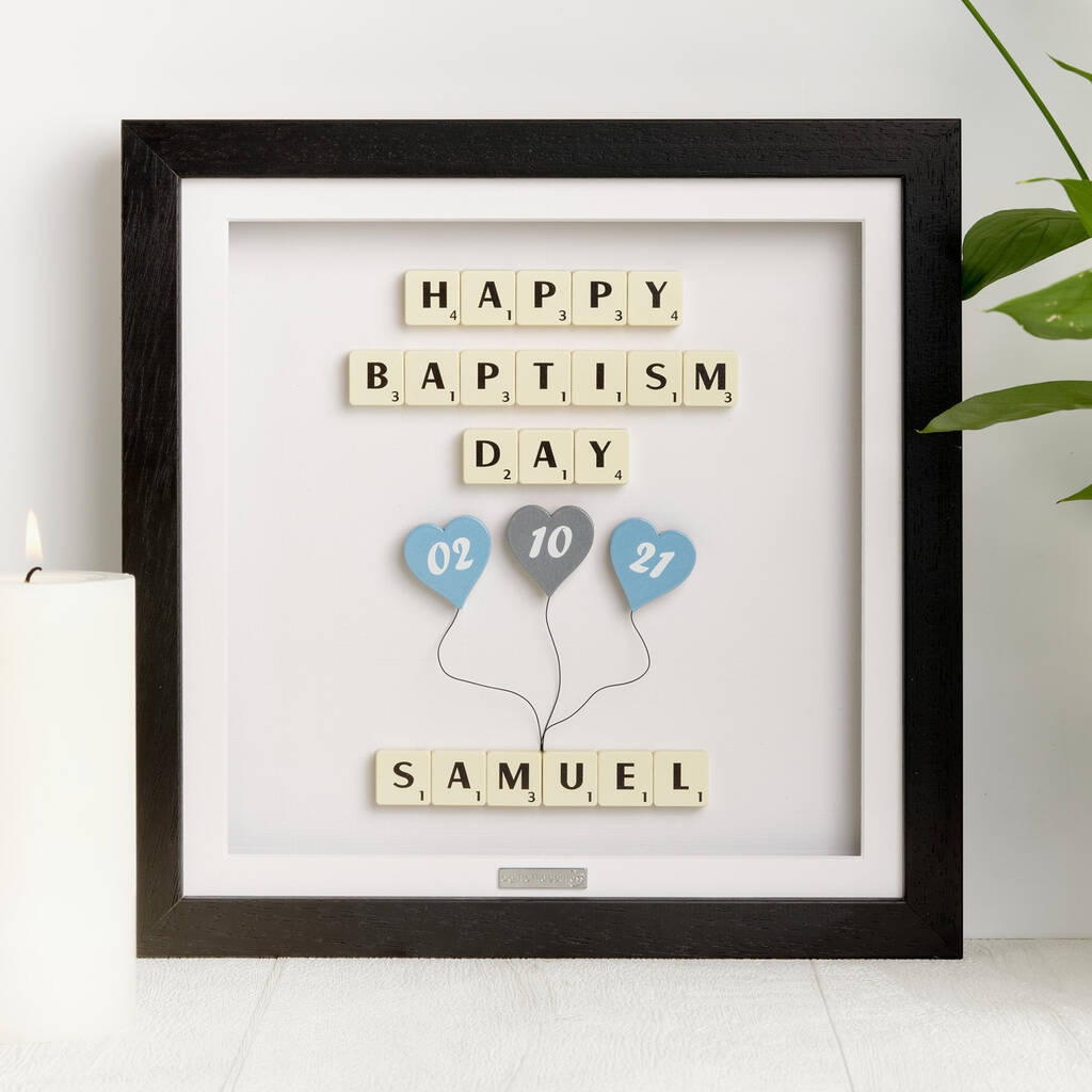•• SCRABBLE LETTER TILES •• The phrase "Happy Baptism Day" and the child’s name are produced using UV-printed Scrabble tiles made in-house for clarity, durability, and perfect alignment. The tiles add character while maintaining an elegant and understated overall aesthetic.