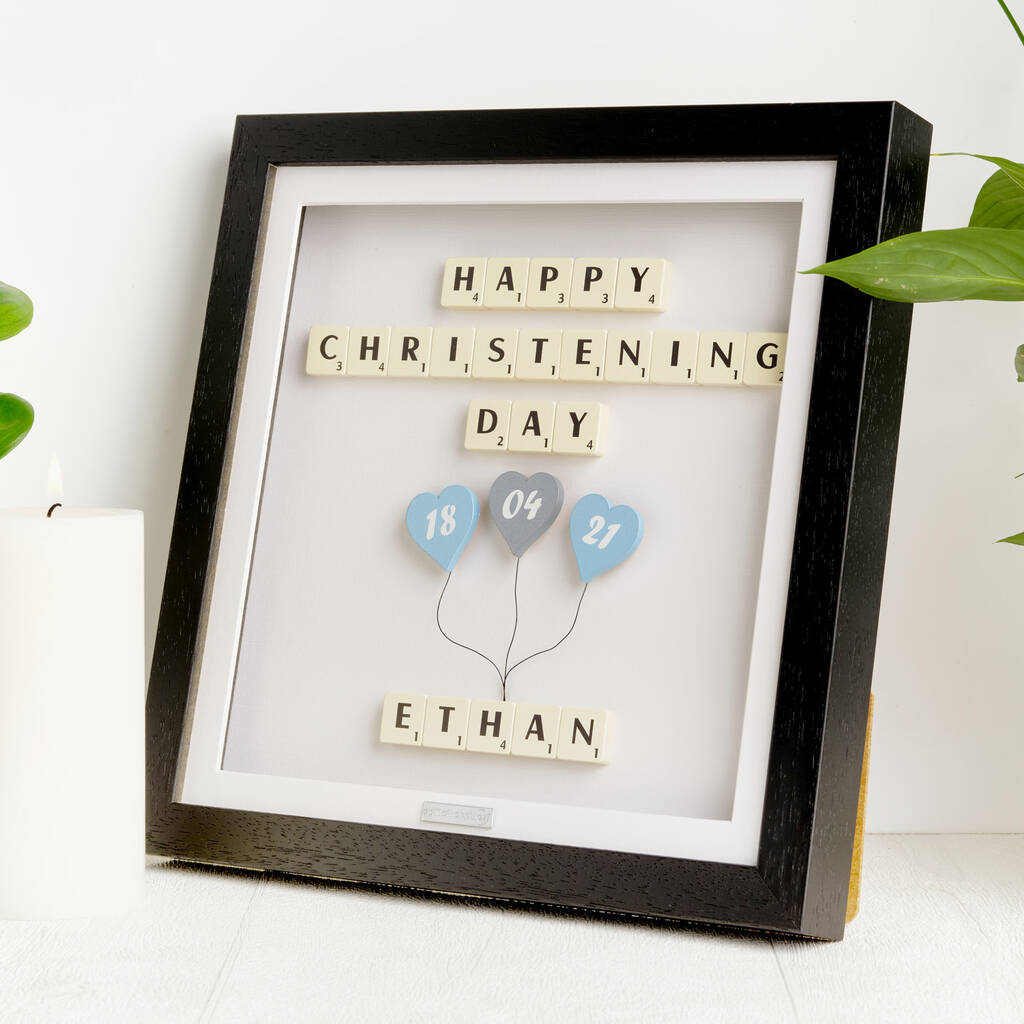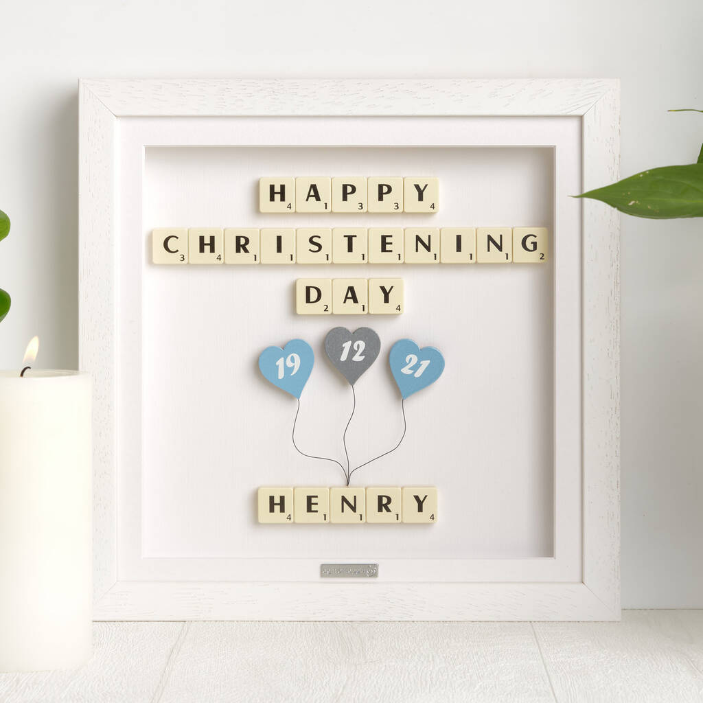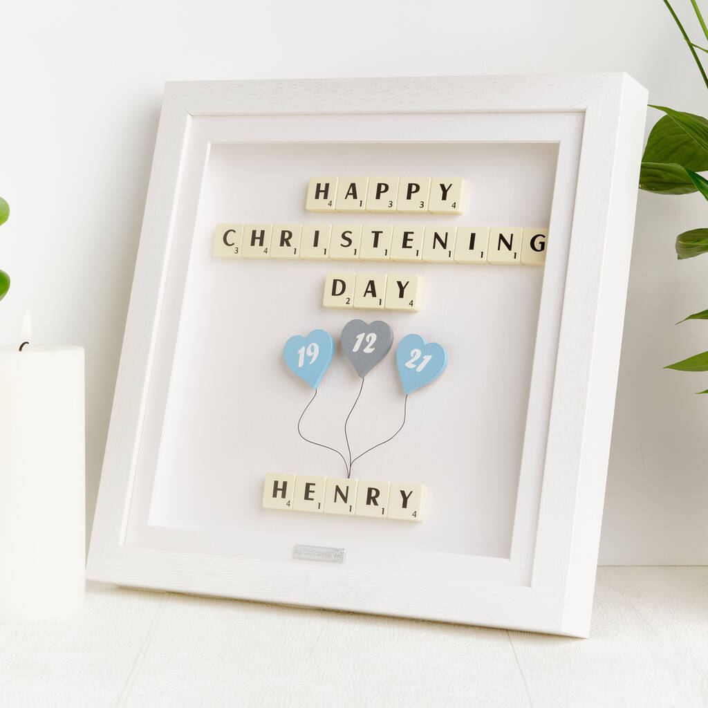 •• PERSONALISED SCRABBLE LETTER TILES •• The words “Happy Christening Day” and the baby’s name are created using UV-printed Scrabble letter tiles, produced in-house with specialist technology. This process guarantees sharp clarity, lasting durability and perfect alignment. The tiles bring a touch of playful charm while maintaining the elegance expected of a christening gift.