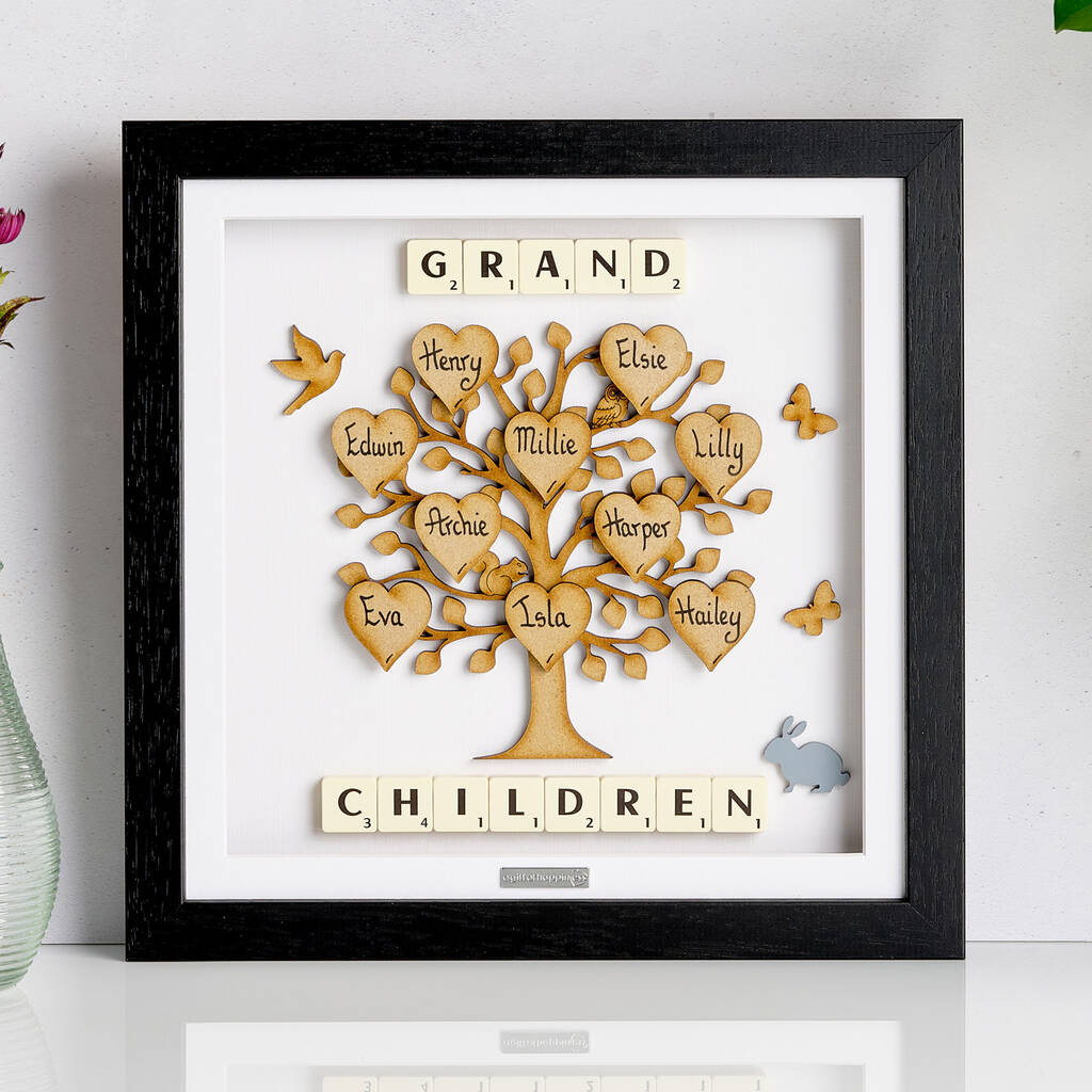 Names are added to the tree in the order provided, flowing naturally from the top down in a symmetrical layout. Our designers arrange every composition to achieve perfect balance and visual harmony. Please note that this is a decorative artwork, designed to display all family names neatly and symmetrically across the tree for a harmonious finish, rather than following the structured layout of a traditional family tree, which is usually not possible due to size and space restrictions.
