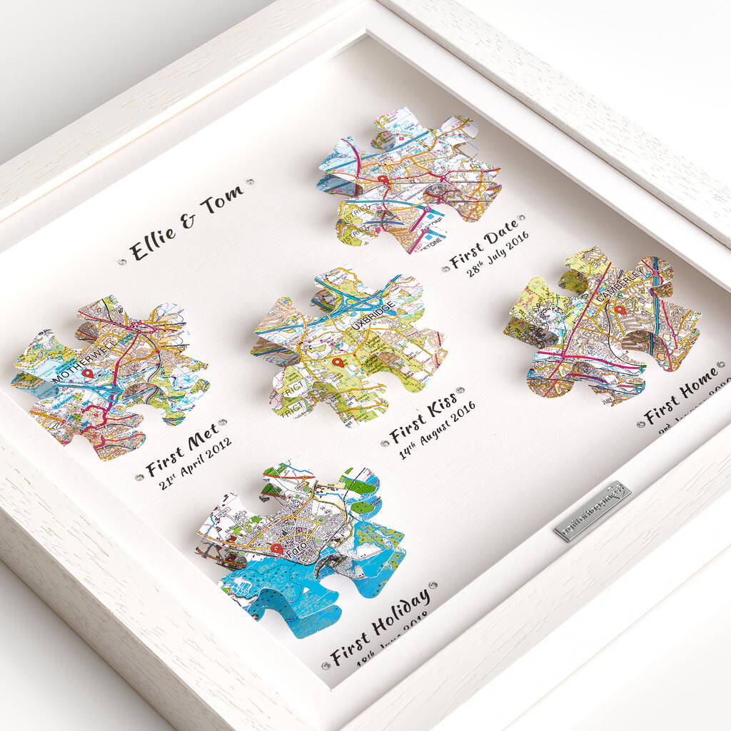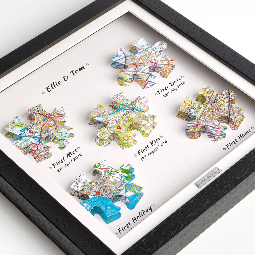 •• SOLID WOOD FRAMES •• Presented in a solid wood deep-box frame with a glass front, available in Dove White or Sable Black. The depth enhances the jigsaw design, while the craftsmanship ensures strength and refinement. Designed for versatility, it can be styled freestanding on a shelf, mantelpiece, or table, or wall hung as a striking centrepiece. Both colours, Sable Black and Dove White, complement a range of interiors, making it a heartfelt wedding, anniversary, or engagement gift.