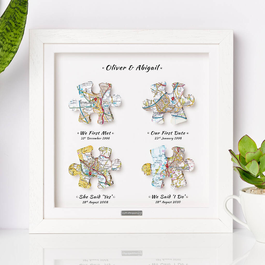 Handcrafted in our Yorkshire studio, this personalised jigsaw map print transforms four milestones into a beautifully made artwork, piecing your love story together through the places that shaped it. Each jigsaw piece represents part of your journey, from where you met, to your engagement, wedding, honeymoon, or any treasured memory.