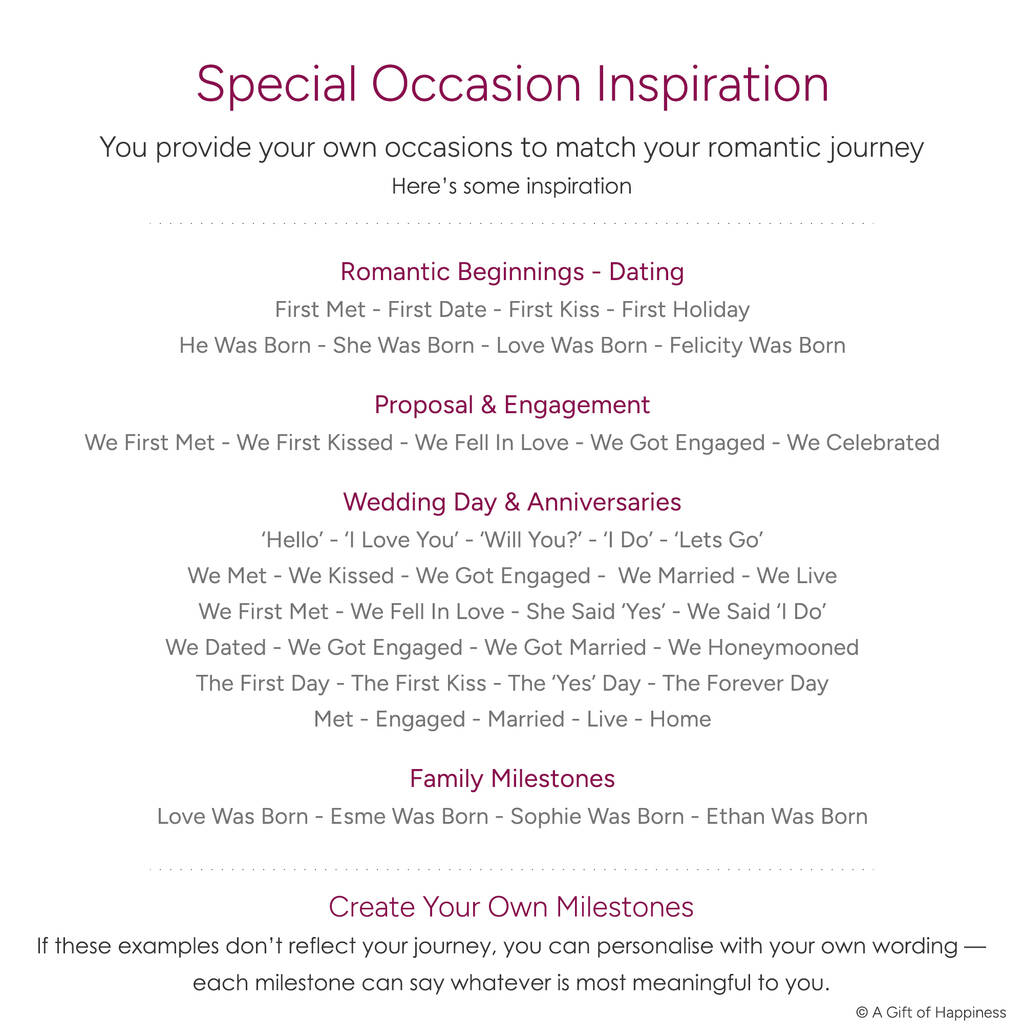 •• PERSONALISED TEXT •• Add your names alongside milestone titles (e.g. ‘Hello’, ‘I Love You’, ‘Will You?’, ‘I Do’). Dates may also be included in your chosen style — 14.07.2022, 14th July 2022, or simply 2022.