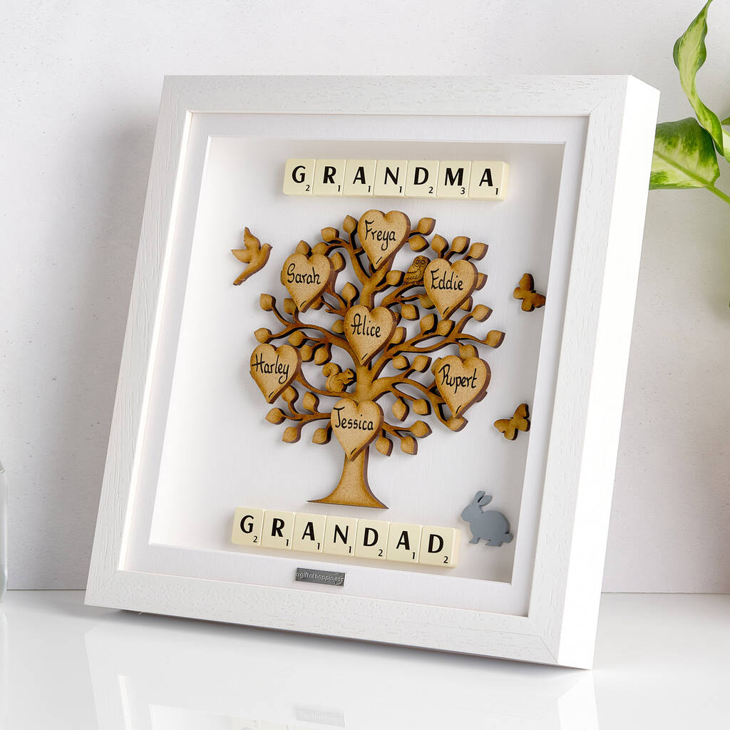 •• NAME HEARTS AND PERSONALISATION •• Every grandchild’s name is handwritten on a wooden heart, transforming the frame into something personal and meaningful. These hearts are arranged with care to create balance and flow. Above or below the tree, personalised Scrabble tiles provide the final detail. Each tile is printed with crisp lettering, allowing you to add wording such as BEST GRANDAD or any phrase meaningful to your family.