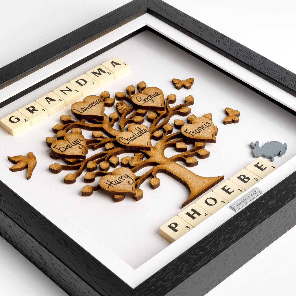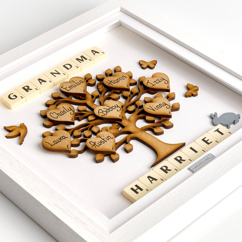 •• NAME HEARTS AND PERSONALISATION •• Every grandchild’s name is handwritten on a wooden heart, turning the design into something deeply personal and sentimental. Above or below the tree, Scrabble tiles provide the finishing touch. Each tile is precision printed with crisp lettering, giving you the freedom to add wording such as BEST GRANDMA or a custom phrase that holds meaning for your family.