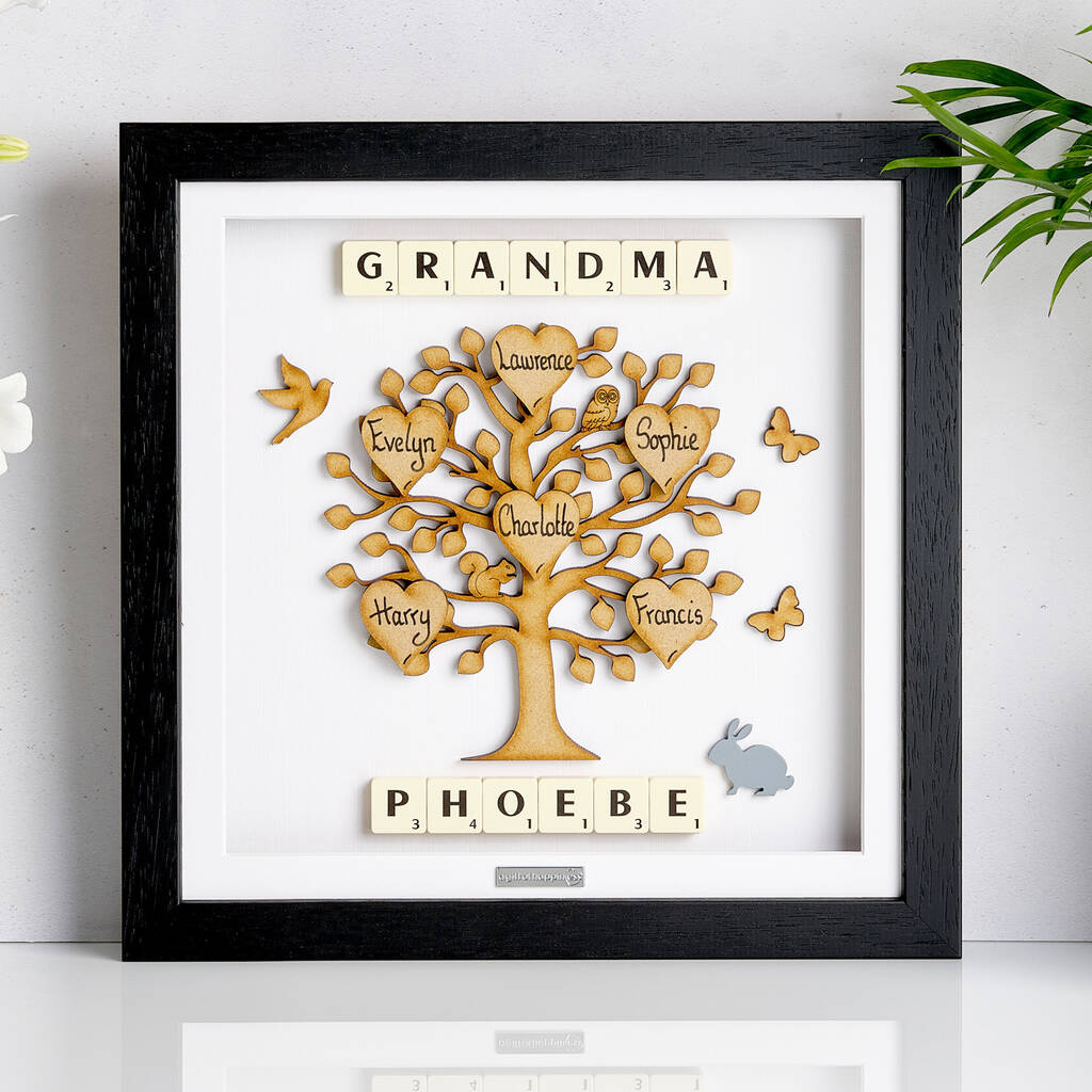A thoughtful personalised gift for Grandma, this handmade Grandchildren Family Tree frame beautifully captures the bond she shares with her grandkids. Woodland details, including an owl, squirrel, butterflies, a dove, and our signature grey rabbit, bring charm to the design, while wooden name hearts for each grandchild sit alongside printed Scrabble tiles for a distinctive personalised finish.
