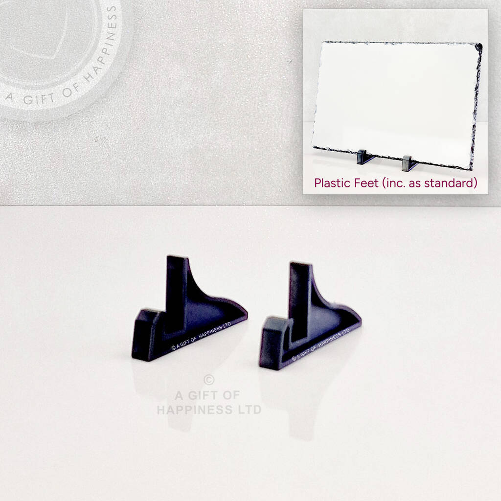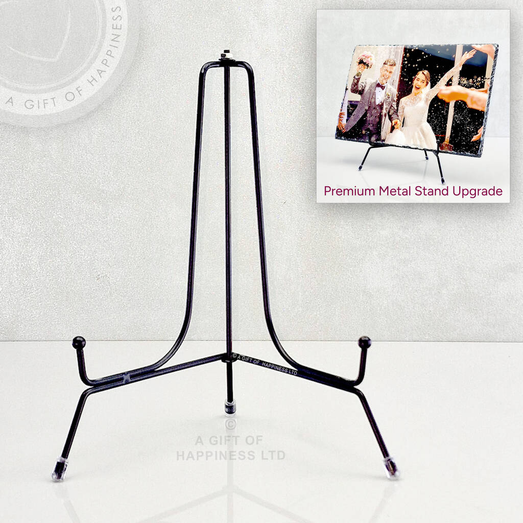 •• PREMIUM METAL STAND •• Each slate includes two plastic display feet as standard. You can also upgrade to our Premium Metal Stand, featuring a sleek, minimalist design that complements the slate’s natural texture and provides added stability—a stylish way to display your photo slate in any room.