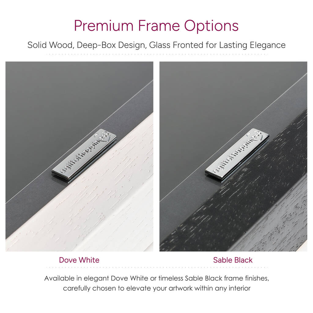 •• SOLID WOOD FRAME •• Encasing the artwork is a solid wood box frame, available in Sable Black or Dove White. The deep-box profile allows the floating design to stand out, while the protective glass front preserves every detail.