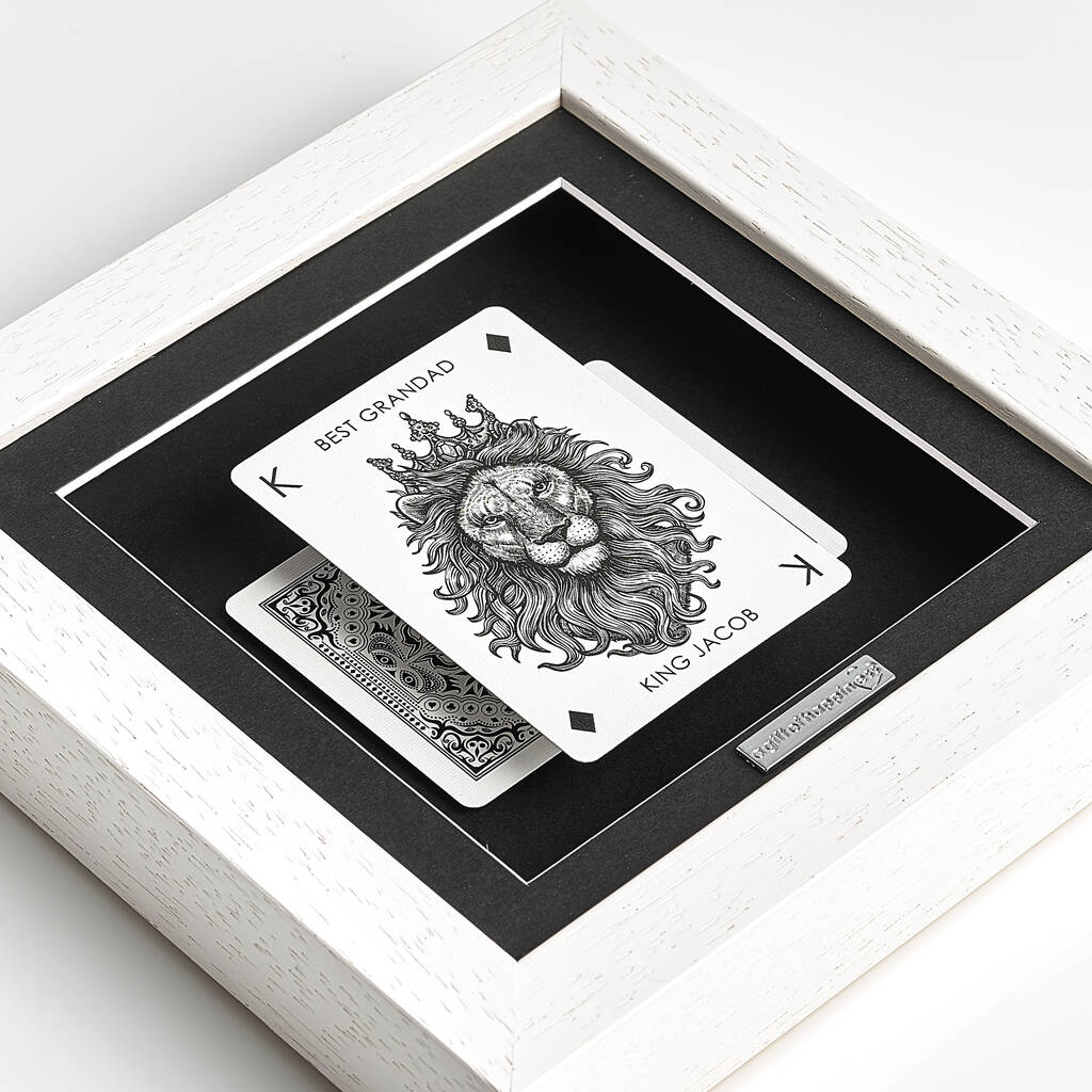 •• PREMIUM PLAYING CARDS •• Every frame begins with Bicycle® brand playing cards, admired worldwide for their quality and signature linen texture. Supplied blank direct from the manufacturer, they are transformed in our studio using specialist UV printing. This process layers colour to create a raised ink effect, ensuring each personalised detail feels rich and full of depth.