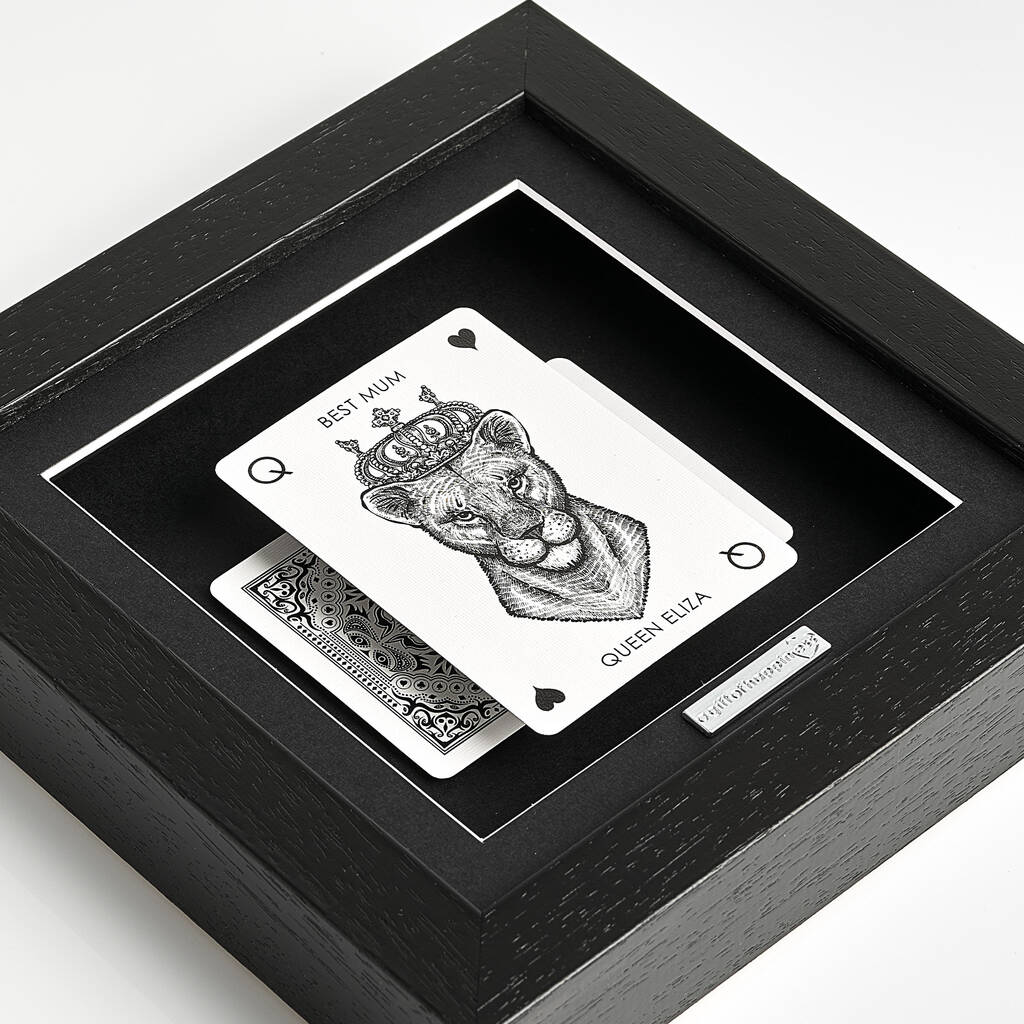 •• PREMIUM PLAYING CARDS •• Each frame begins with Bicycle® brand playing cards, world-renowned for their heritage quality and distinctive linen texture. Supplied blank direct from the manufacturer, the cards are transformed in our studio using specialist UV printing. This process creates a raised ink effect, giving every personalised detail richness and depth.
