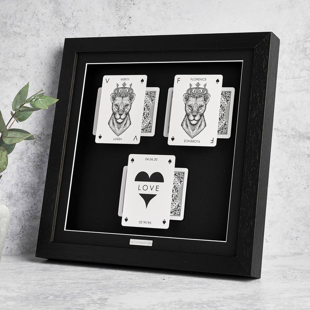 This design transforms playing cards into a symbol of love and devotion, making it the perfect personalised lesbian couples gift for dating anniversaries, Valentine’s, Christmas, or birthdays. Featuring regal Royal Lioness portraits, each card is personalised with your names, while the central heart card can display a word or phrase of your choice along with a meaningful date. Beautifully handcrafted in a three-dimensional floating style, the cards are presented within a solid wood, glass-fronted frame. A thoughtful gift for girlfriend or partner, it is a keepsake that celebrates romance, artistry, and timeless detail, a truly unforgettable relationship gift