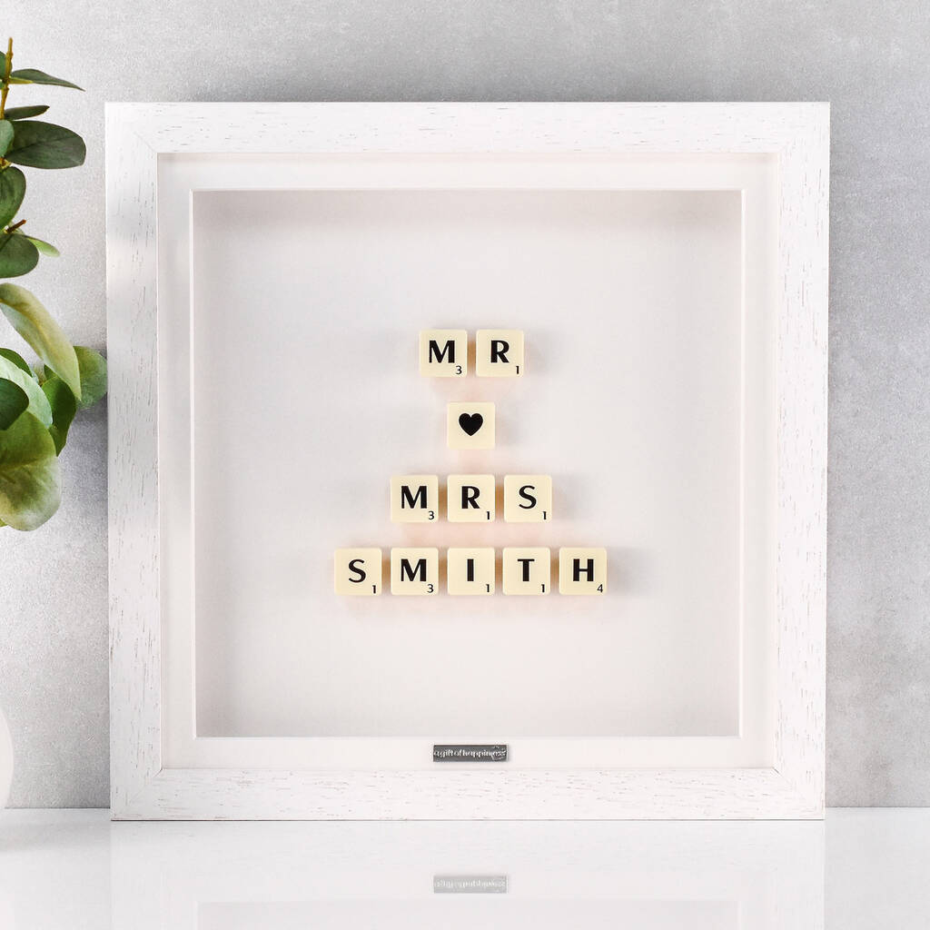 Celebrate marriage with our Personalised Mr & Mrs Scrabble Gift Frame, a timeless wedding gift for newlyweds and a bespoke anniversary keepsake crafted with love.