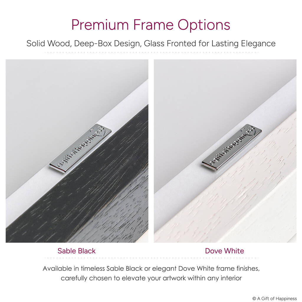 • Every product is presented in a solid wood deep-box frame with a glass front. Choose between Sable Black or Dove White.