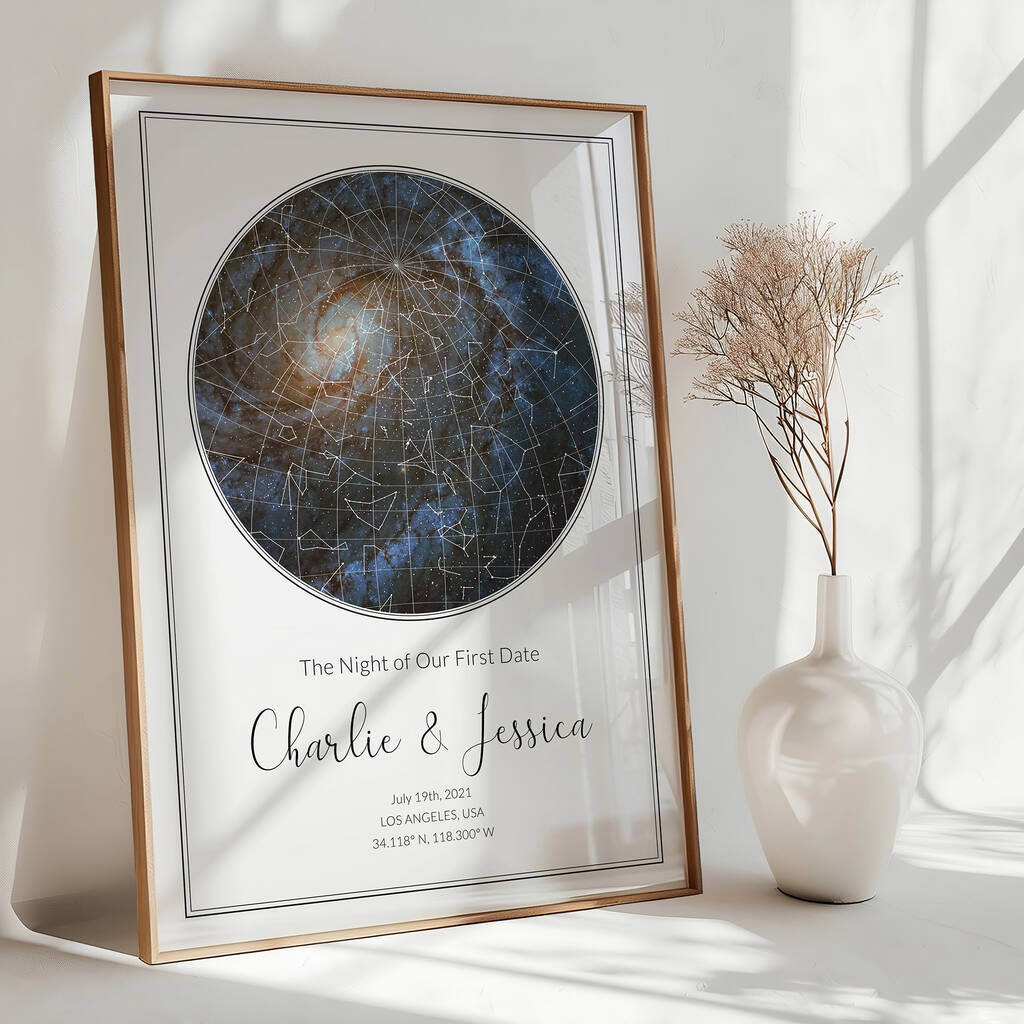 Personalise your star map picture with a meaningful occasion such as “The Night Of Our First Date”, your names, the location, and a special date and time (time optional) to create a beautiful piece of bespoke wall art that captures a truly magical milestone in your relationship. Each design is finished with the precise celestial coordinates of your chosen location, subtly anchoring your moment to the stars above exactly as they appeared at that unforgettable time.