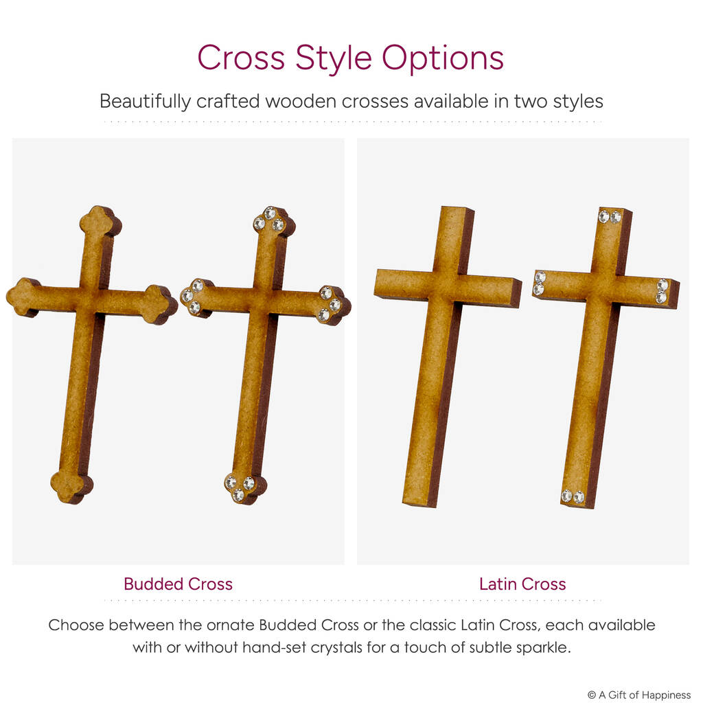 •• WOODEN CROSS •• Two laser-cut wooden cross styles are available for selection, including a traditional Budded Cross design and a Latin Cross design. Both can be selected in plain or crystal-embellished styles, featuring genuine, finely cut crystals hand-set to catch the light beautifully.