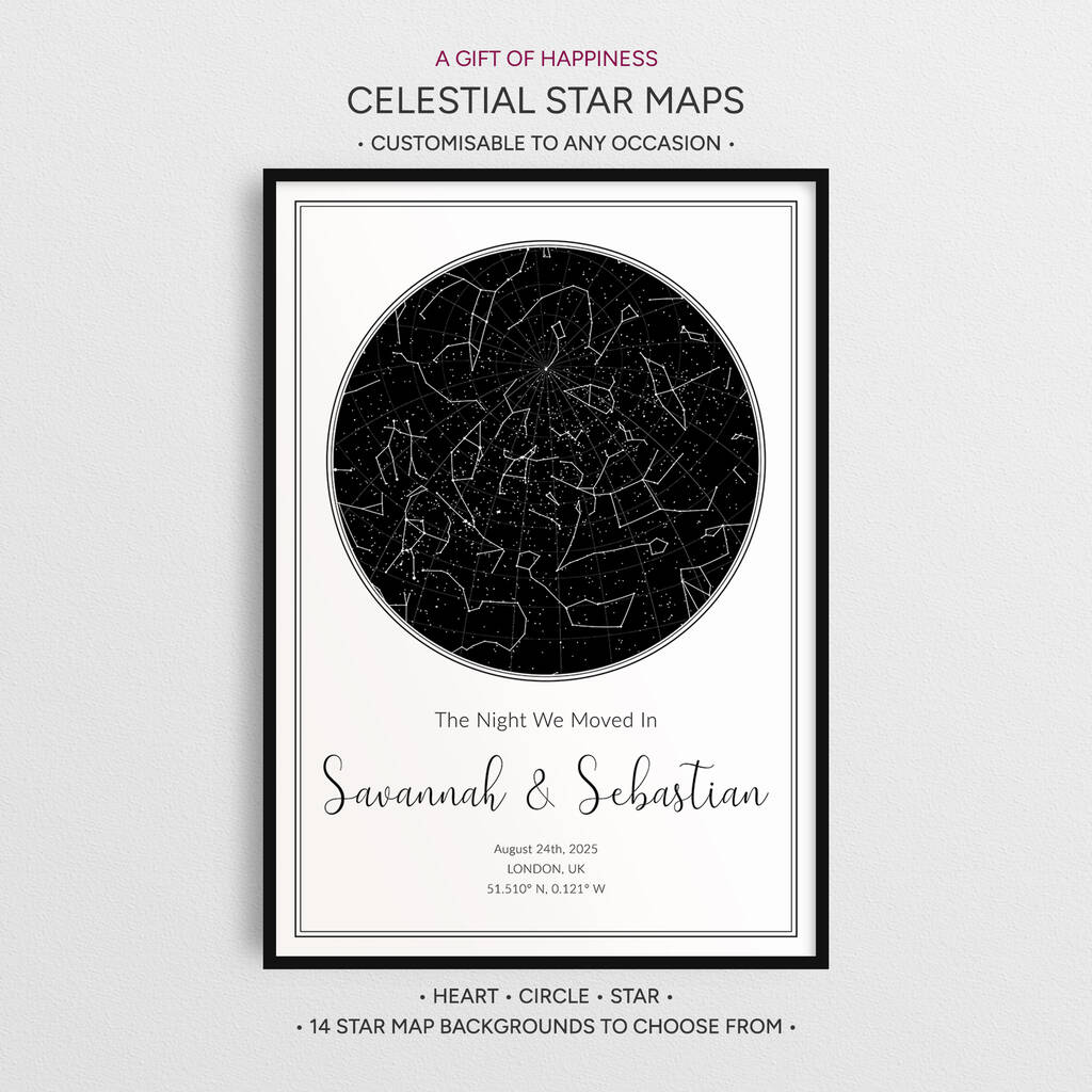 Ideal as a housewarming or new-home gift, this star map poster is designed to be displayed with pride in your new living space. A perfect, heartfelt moving-in present.