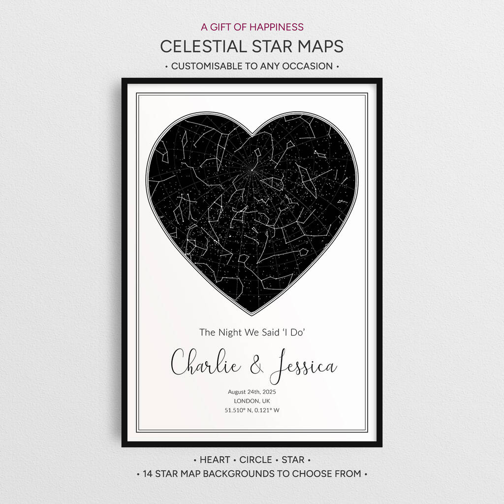 Your star map can be customised to suit any theme or occasion. With fully editable text, it becomes a truly unique and meaningful gift, perfect for dating anniversaries, engagements, weddings, wedding anniversaries, Valentine’s and more.