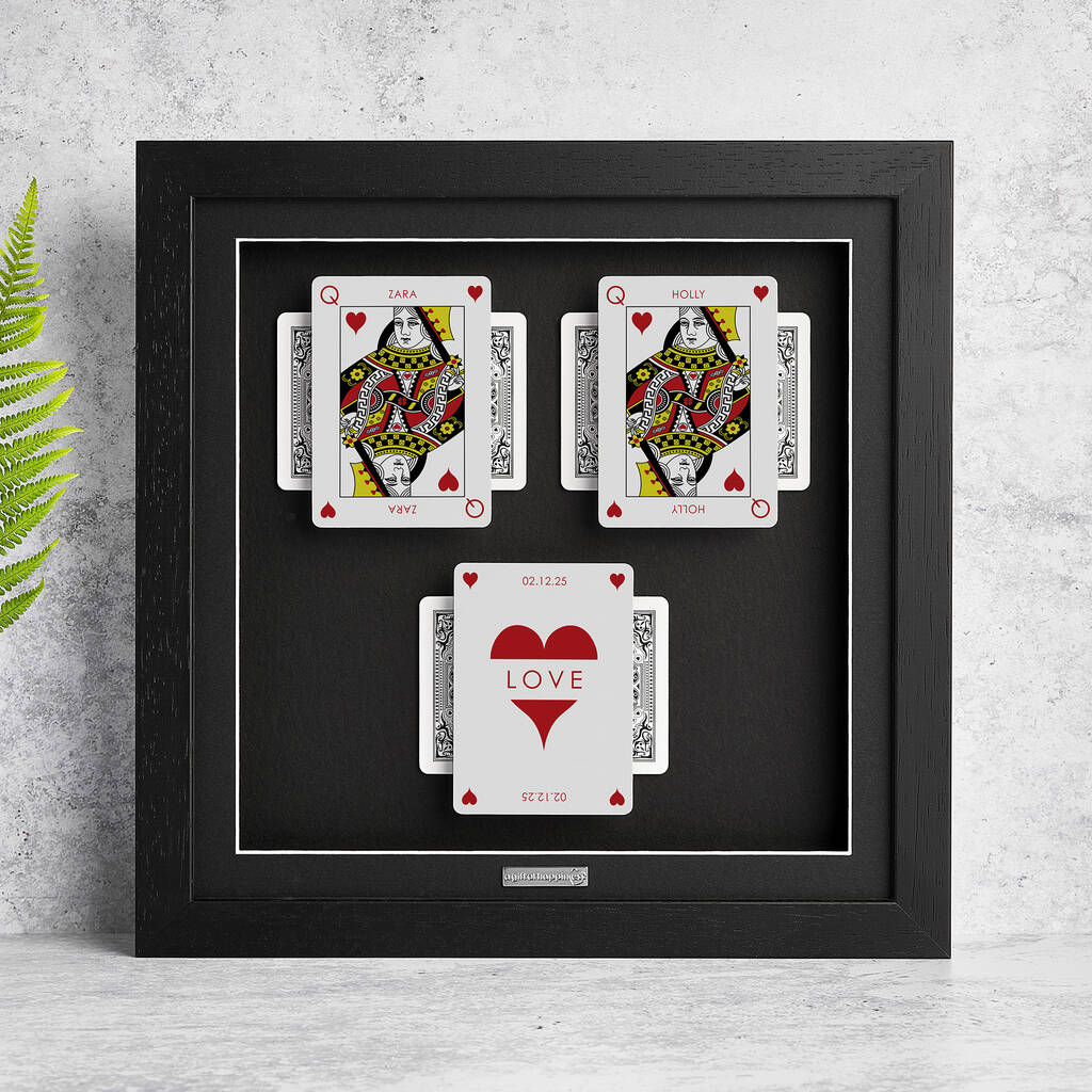 The Perfect Hand, a personalised artwork created to embody devotion, grace and strength. Two Queens, each personalised with your names, stand elegantly side by side as symbols of lasting love and unity. The centre card carries a bold heart, your chosen word or surname, and a special date. Royal illustrations in rich red or classic black give each suit distinct character, inspired by timeless traditional playing card design. Set within a solid wood frame, the cards appear to float in a refined three-dimensional display, a same sex couple gift for Two Brides, Mrs and Mrs, and a lasting keepsake for any lesbian couple.