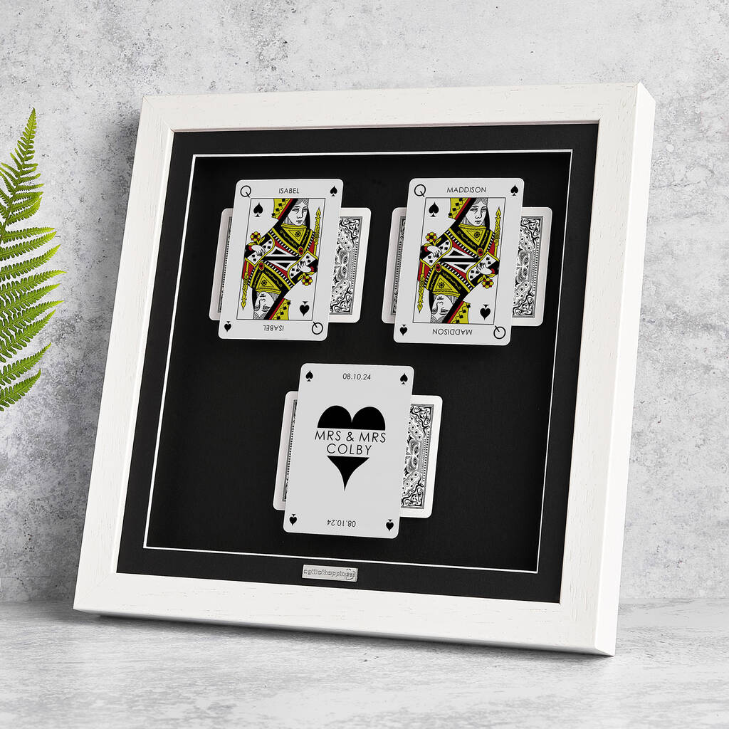 •• ORIGINAL DESIGN •• Created exclusively by A Gift of Happiness, this artwork is unlike any other. Two Queens stand proudly side by side, bearing your names as a beautiful and romantic expression of Two Brides united. Between them rests a central card, crowned with a heart and personalised with your surname or chosen word alongside a meaningful date. Arranged in a carefully balanced three-dimensional composition, the cards appear to float within the frame, transforming familiar playing cards into a striking display of love and devotion. More than wall art, it is a statement piece: a Mrs and Mrs gift that embodies strength, elegance and unity.