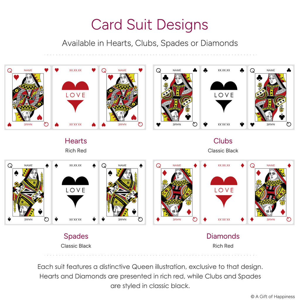 •• SUIT CHOICE •• Select from hearts, diamonds, clubs or spades. Each suit reveals its own distinctive Queen illustration, inspired by traditional playing card design. Hearts and diamonds are in rich red, while clubs and spades are styled in classic black. The Queens reflect your chosen suit, while the central card always carries a heart, symbolising love, no matter the path you choose.