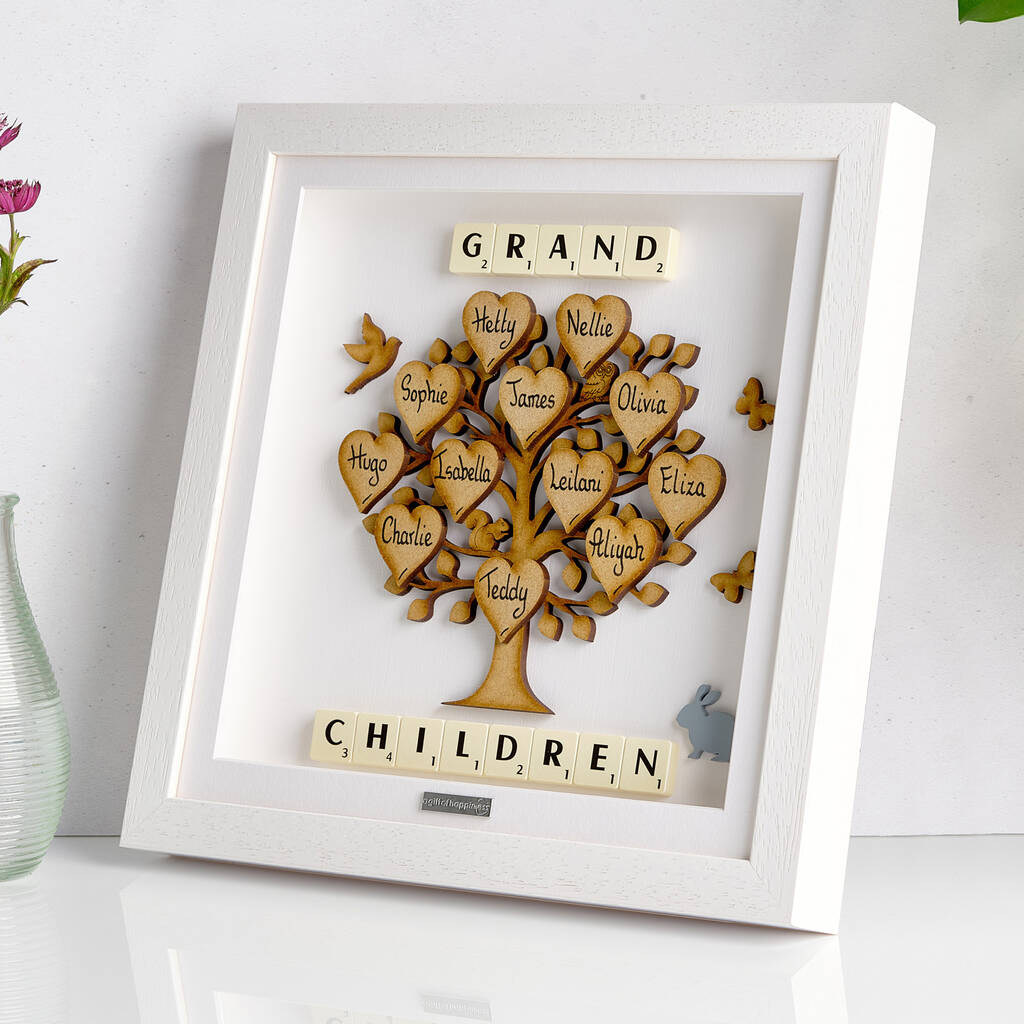 Introducing our custom-made wooden Grandchildren family tree picture, lovingly crafted with thoughtful details, grandchildren's names, and Scrabble tiles. The perfect gift from grandchildren to grandparents.