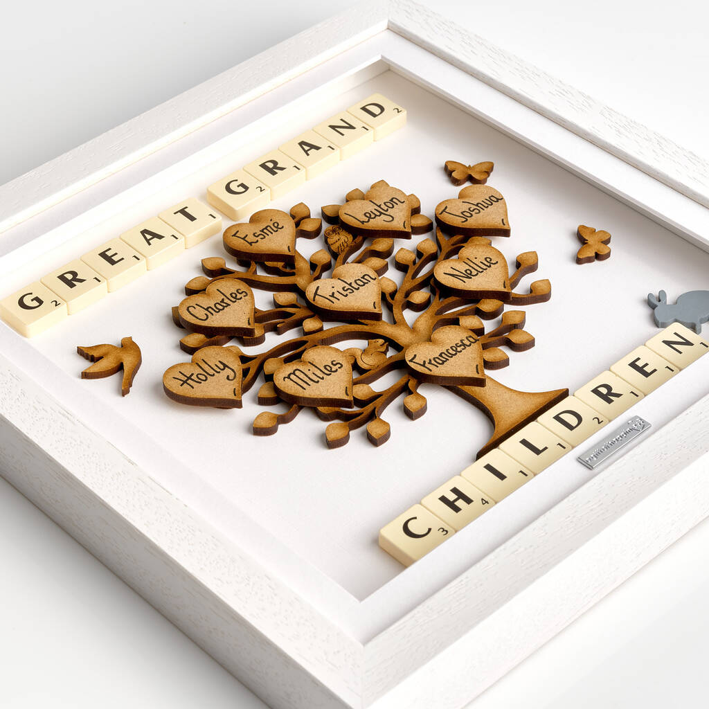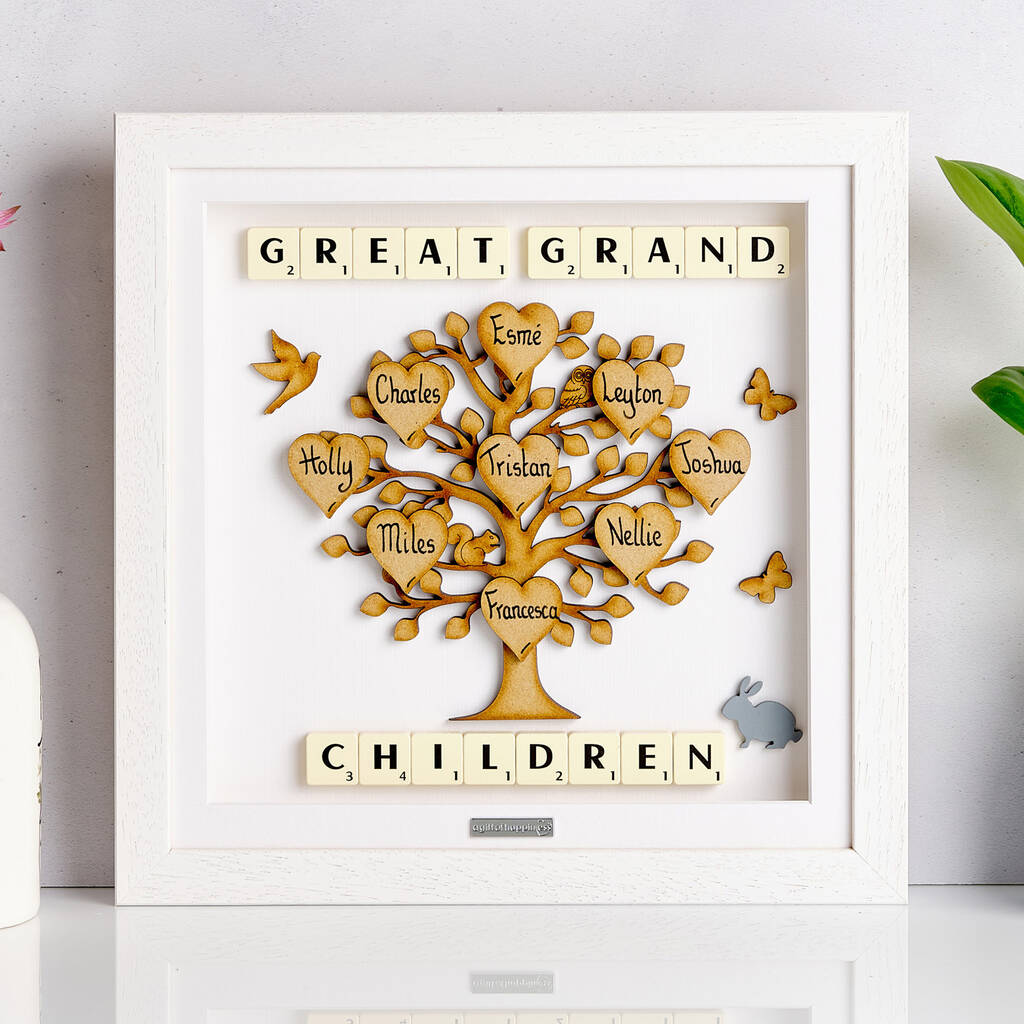 An enchanting wooden Great-Grandchildren family tree gift frame, the perfect gift from great-grandchildren to great-grandparents, featuring woodland creatures, Scrabble tiles, and personalised names.