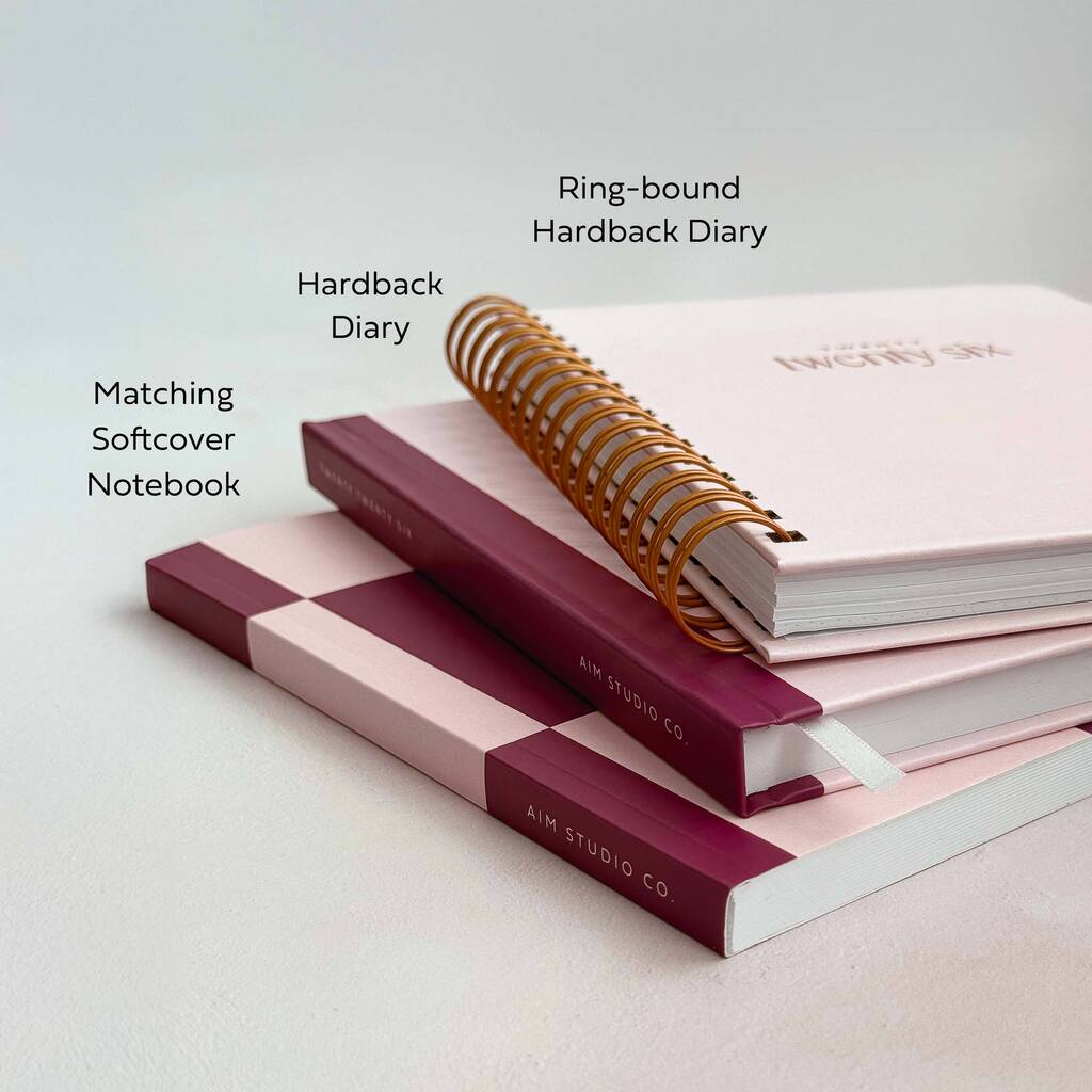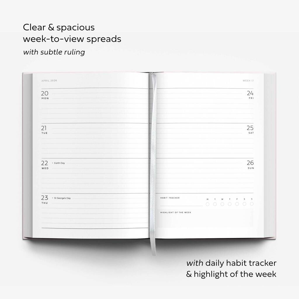 + 2026 Planner: Encased in a pale pink hardback cover with gold foiled 2026 typography. Features week to view diary format with UK bank holidays, daily habit tracker and more.