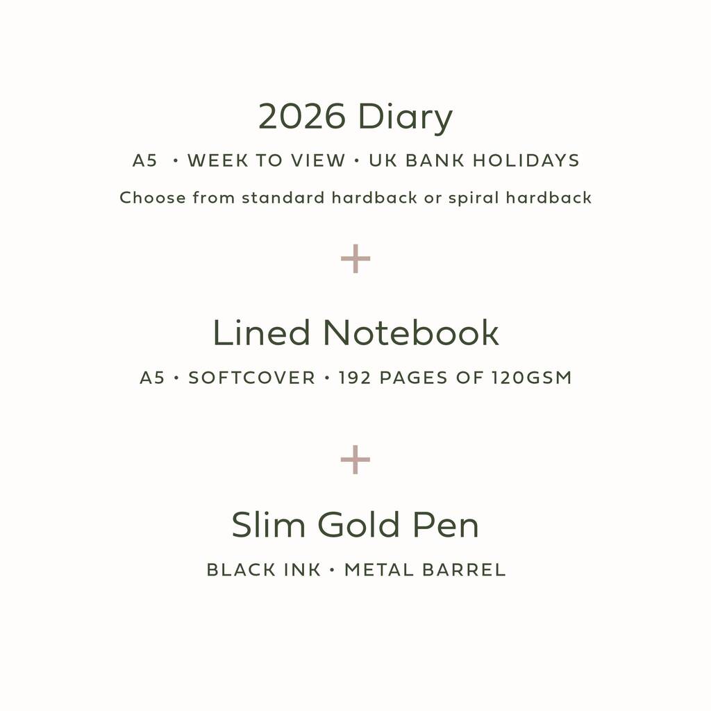 This diary, notebook and pen gift set is also available in 2 other colour options. Shop the sage green and rust brown stationery sets from our storefront, along with the full 2026 planner range and more personalised gift ideas for Christmas.