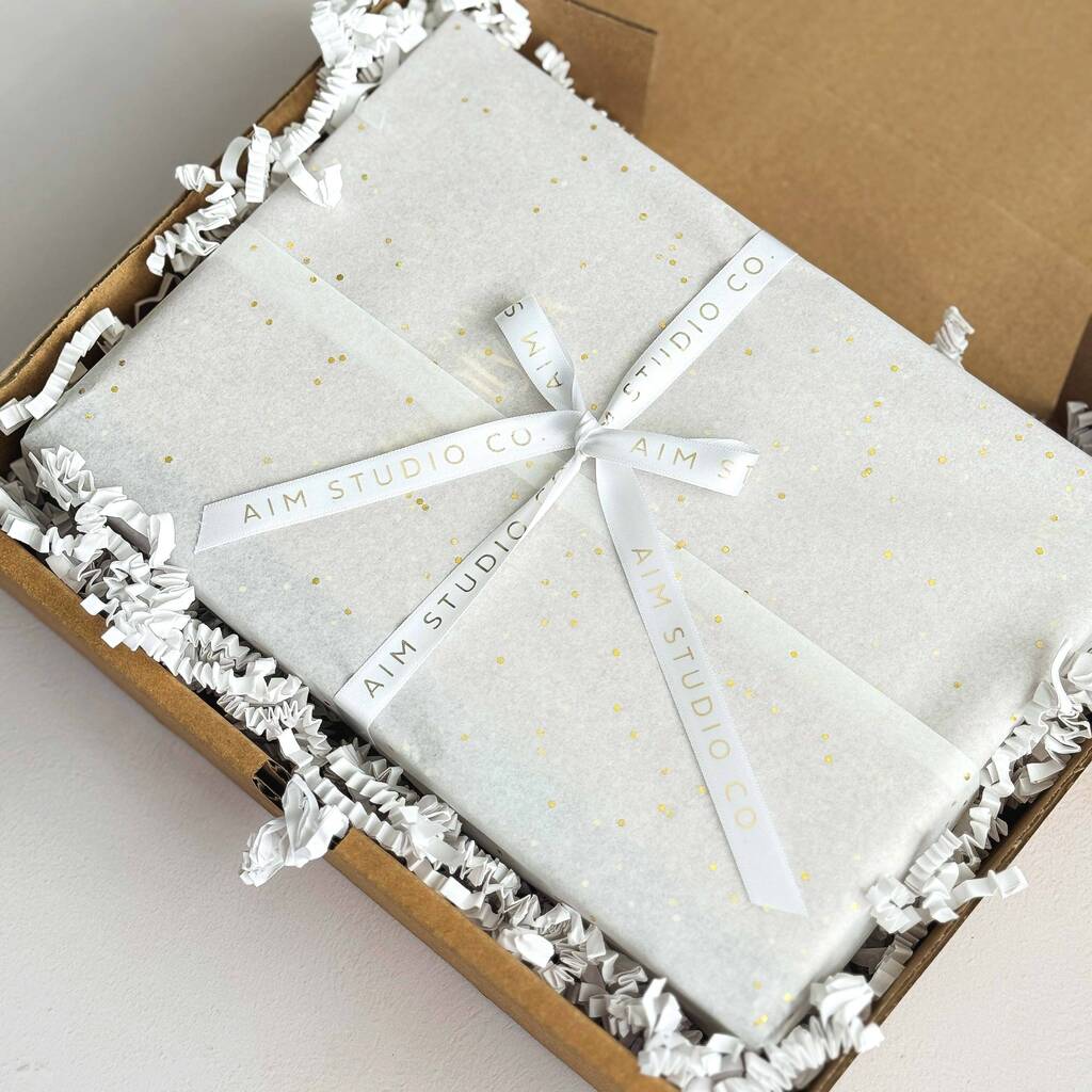 Includes white tissue paper gift wrap and tied with an AIM Studio Co ribbon. Packaged in a brown cardboard box, ideal for sending direct as a gift for Christmas.