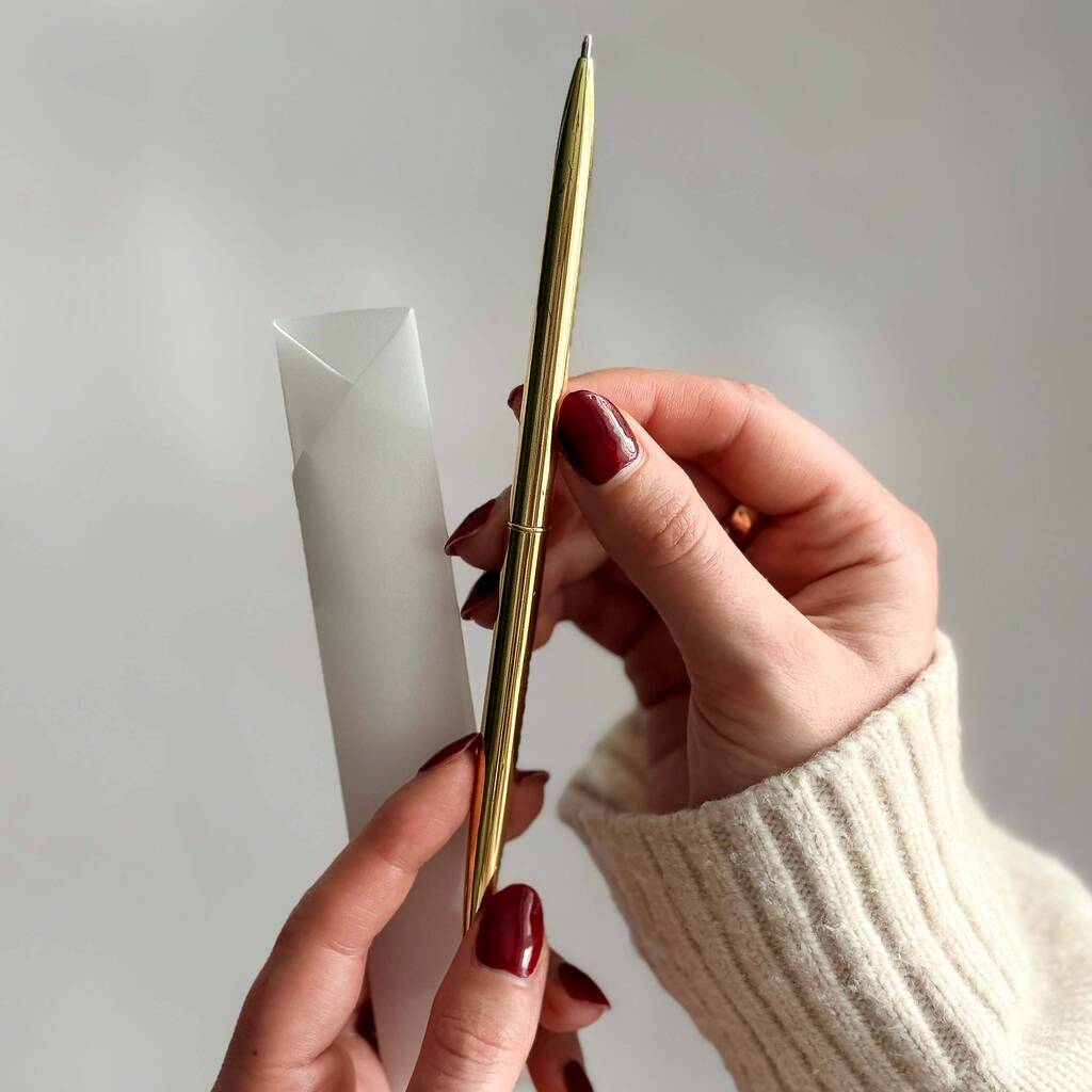 ⭐️ Pen: Slim gold metal barrel, wirtes in black ballpoint ink.