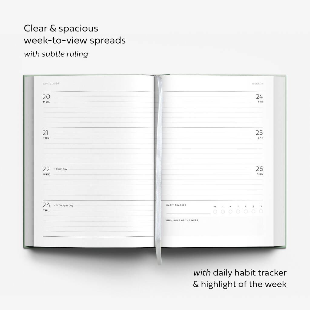 - Personalised Sage Green 2026 Diary: Week to view planner with daily habit tracker, monthly overviews & bank holidays.