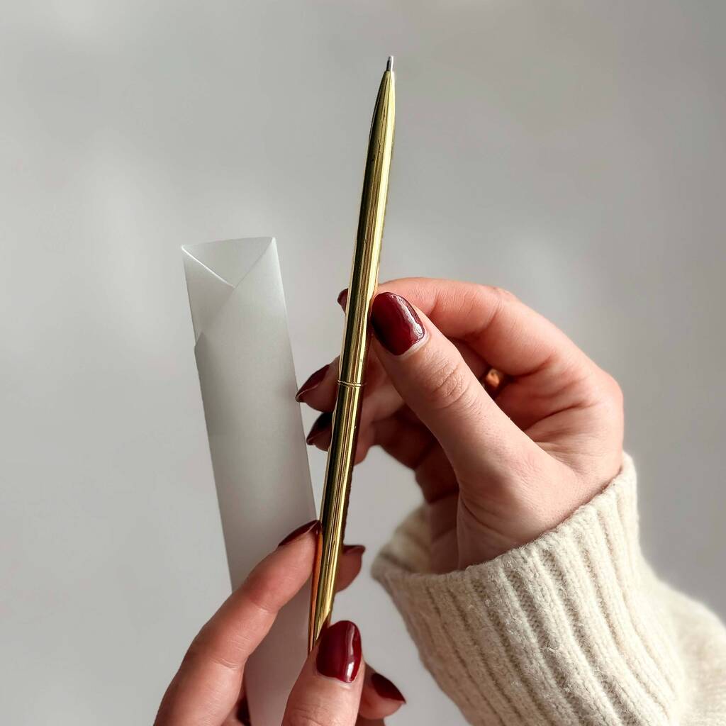 - Pen: Black ballpoint pen with slim gold metal barrel.
