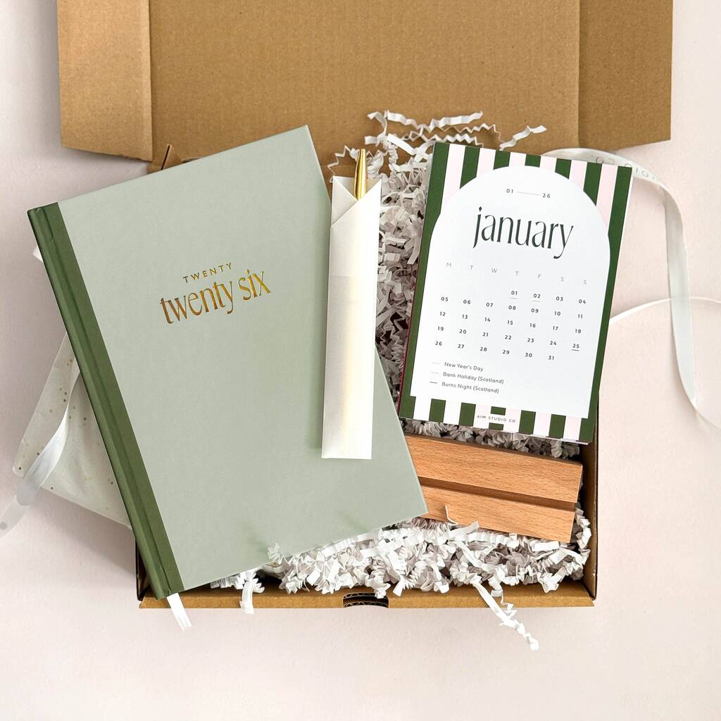 The ideal Christmas gift for girlfriends, or any woman who loves to keep her office desk organised. This stationery gift set pairs our bestselling sage green diary with a 2026 stripe desk calendar to help stay on track.