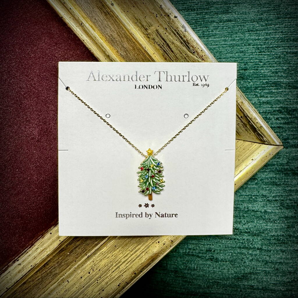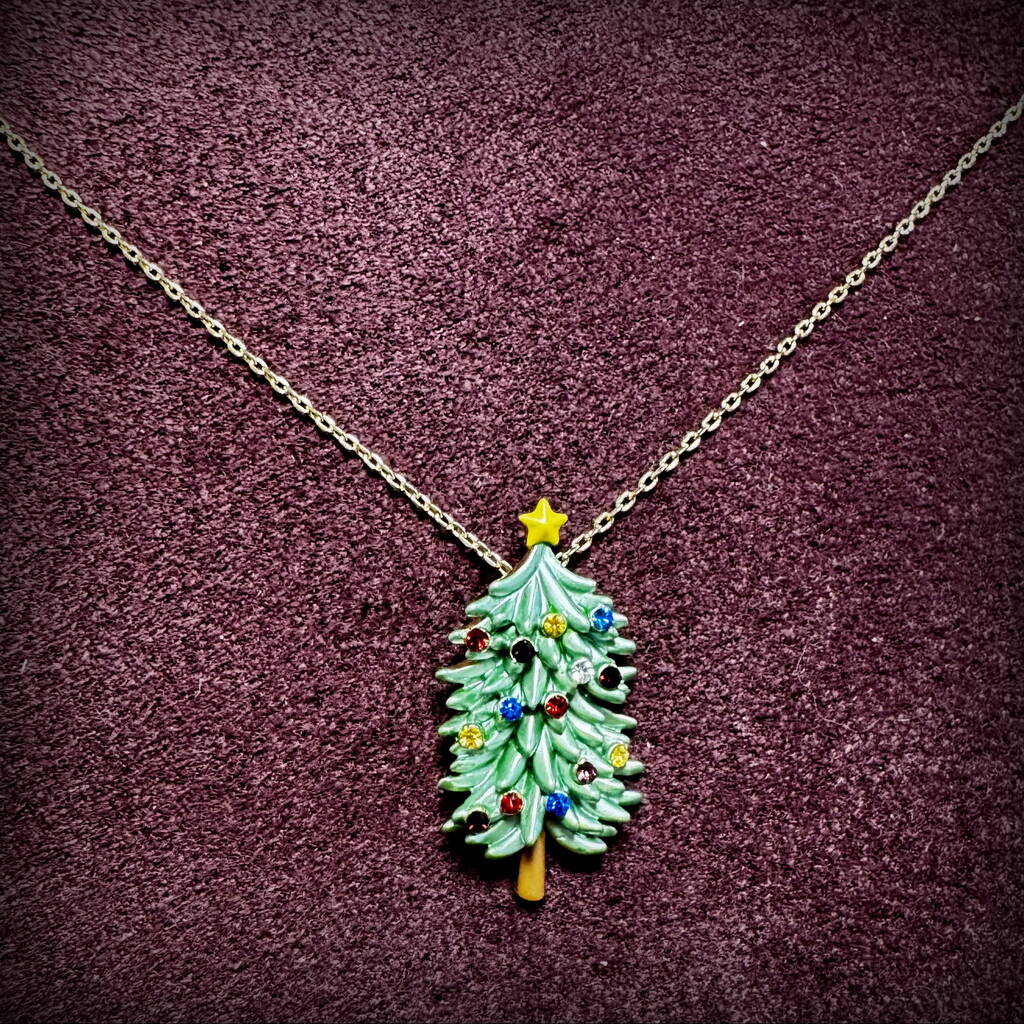 Christmas Tree Necklace, with hand enamelled green branches, yellow star and multi-coloured diamante twinkling crystals.